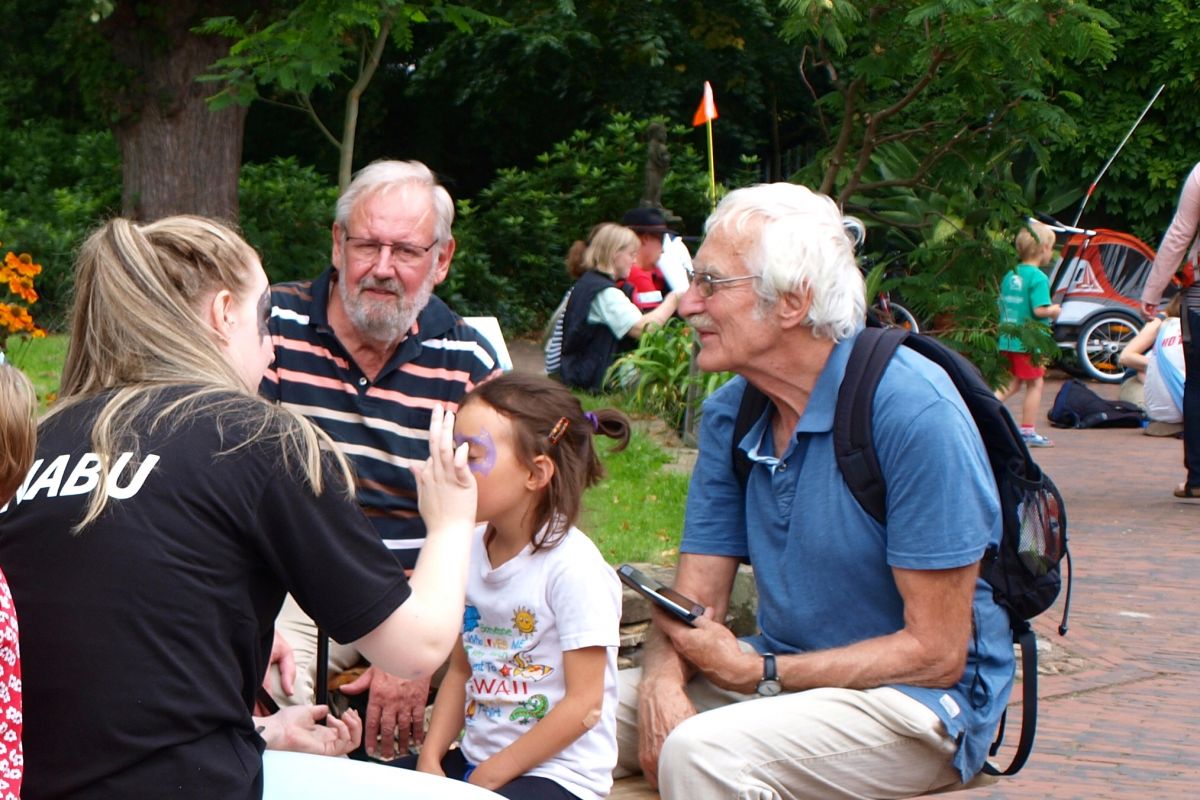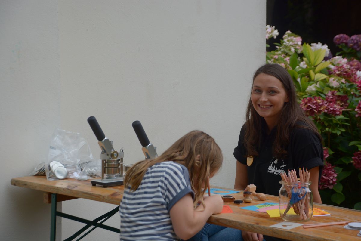 Lena Drieling, die ihr Freiwilliges Ökologisches Jahr in der Bezirksgeschäftsstelle in Oldenburg absolviert hat, konnten wir vor ihrem Studium für das Kinderschminken einspannen: „Ich wollte nochmal Spaß haben mit den Leuten – und wir wollen doch alle was für den Naturschutz tun – und für die Fledermäuse natürlich.“ Lenas Unterstützerin, Helene Bischoff, antwortete auf die Frage, warum sie heute mit dabei ist, lachend: „Weil meine Tante mich gefragt hat.“