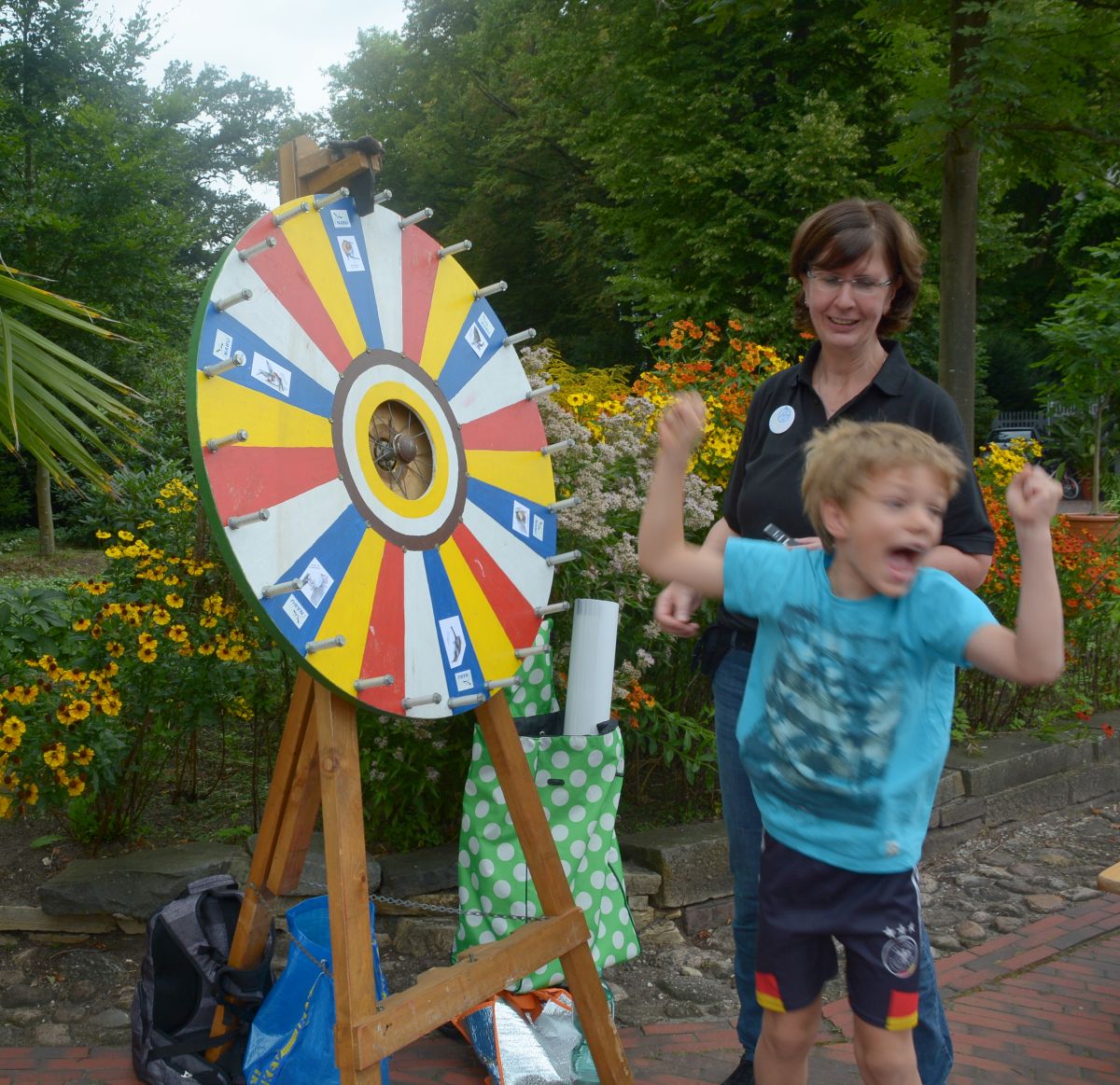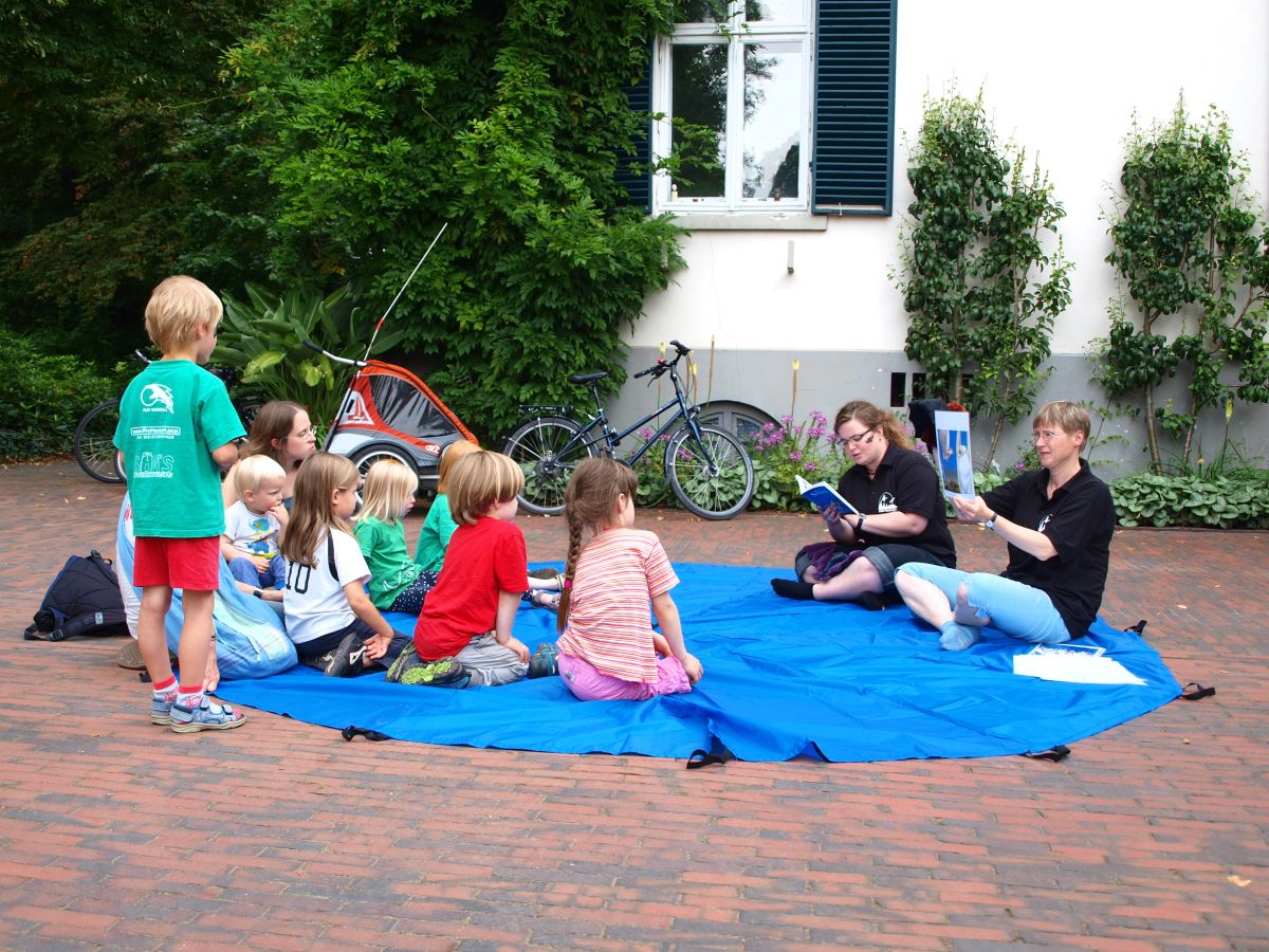 Nach all dem Aufbauen und Warten kamen die ersten Besucher und endlich konnte es losgehen: Das Glückrad und die Pinsel wurden geschwungen und auch das Schwungtuch hat seinen ersten Einsatz. Janna Visser und Heike Neunaber erzählten Geschichten aus dem Leben einer Fledermaus und die Kinder hörten gebannt zu.