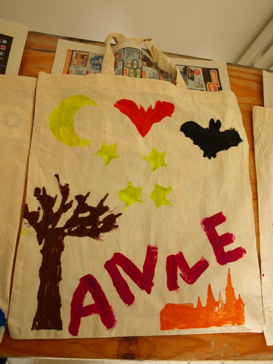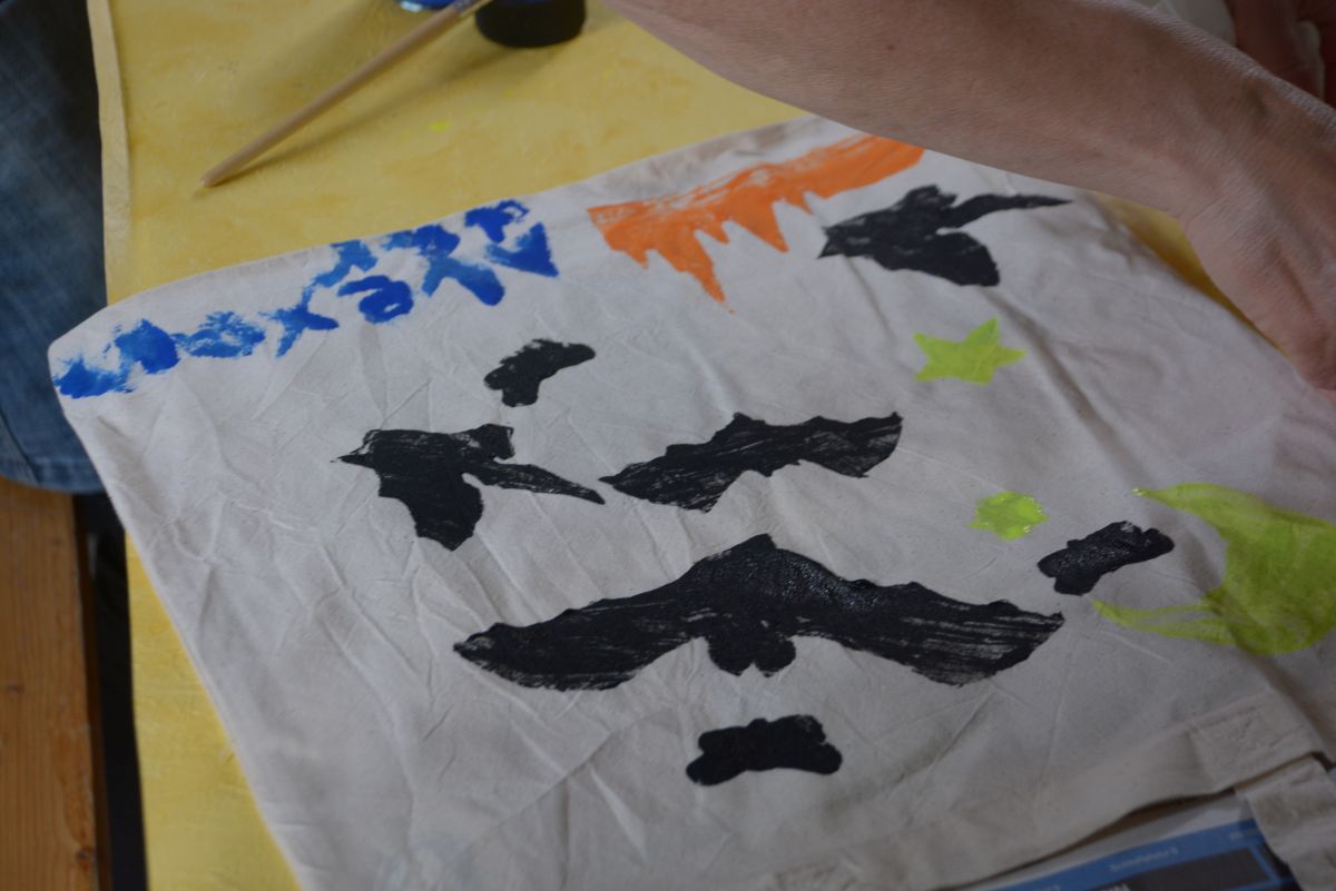 Am Tisch daneben haben Laura Ahrens und Annegret Fischer zunächst mühsam Falten entfernt. Die Baumwolltaschen für die Druckaktion mussten gewaschen und gebügelt werden, bevor das Drucken gut gelang und eine Stempelauswahl wurde geschnitzt. Mit den Stempeln wurde es dann bunt, und das Ergebnis konnte sich sehen lassen! Wer schicke Baumwollbeutel mit NABU Logo und Fledermäusen auf der anderen Seite sieht, weiß hier sofort: Diesen hat Anne gemacht – oder Alexander oder…!