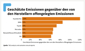 Im Schnitt geben große Automobilhersteller 46,7 Tonnen CO2-Äquivalente pro verkauftem Fahrzeug an. Laut T&E liegen diese jedoch bei 68,2 Tonnen CO2-Äquivalente pro Fahrzeug. So kommt der Unterschied zustande: Automobilhersteller berechnen ihre Gesamtemissionen auf Basis von Faktoren wie der Größe eines Fahrzeugs, seiner Lebensdauer und der Strecke, die das Auto durchschnittlich zurücklegt. Die deutschen Automobilhersteller BMW, Mercedes und VW zählen dabei zu den fünf Unternehmen, die in ihrer Berichterstattung am meisten untertreiben. BMW rechnet für die Emissionen seiner Fahrzeuge mit einer Laufleistung von 150.000 Kilometern. Laut T&E liegt die durchschnittliche Laufleistung eines PKWs aber eher zwischen 150.000 und 270.000 km. Die Emissionen von BMW liegen so laut den Berechnungen sogar 81 Prozent über den angegebenen Werten des Unternehmens. In der Studie wurde mit der Laufleistung der Autos nur eine der Komponenten der Scope-3-Emissionen analysiert. Da andere Emissionen, die in der Wertschöpfungskette der Autos entstehen, nicht betrachtet wurden, ist davon auszugehen, dass die Lücke zwischen den angegebenen und tatsächlichen Emissionen noch höher ist.