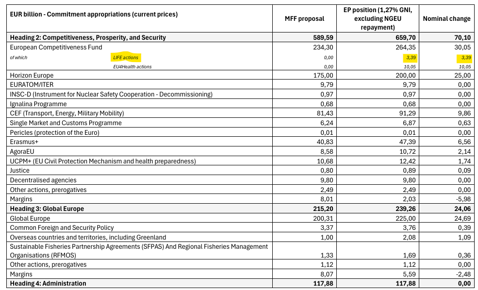 Dem schloss sich nun auch der hauptverantwortliche Haushaltsausschuss ansatzweise an und forderte rund 5 Milliarden Euro im nächsten Haushalt explizit für LIFE-Maßnahmen und somit den Naturschutz auszugeben (3,39 Milliarden Euro innerhalb des Europäischen Wettbewerbsfonds, siehe Grafik; der Rest in EU-Fazilität, siehe Änderungsantrag 49.). Der Zwischenbericht geht aber nicht so weit, LIFE wieder als eigenständiges Programm zu fordern. Diese Forderung fand sich noch in mehreren Änderungsanträgen, die aber im Rahmen der Kompromissfindung leider gestrichen wurden. Auch enttäuschend ist, dass sich die Abgeordneten in dem Bericht nicht zu konkreten Ausgabenzielen für Klima- und Naturschutzmaßnahmen äußern. Trotzdem ist der Bericht des Haushaltsausschusses eine Verbesserung im Vergleich zum Kommissionsvorschlag und ist ein wichtiges Signal, dass Naturschutz ein eigenständiges Budget im nächsten mehrjährigen Finanzrahmen verdient.