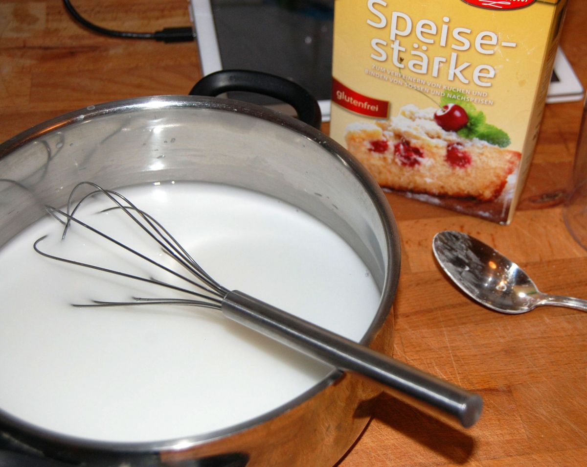 3. Dann in einem Topf 2 EL Speisestärke in 500 ml Wasser eingerührt, kurz aufkochen, und dabei rühren, bis eine zähe Flüssigkeit entsteht.