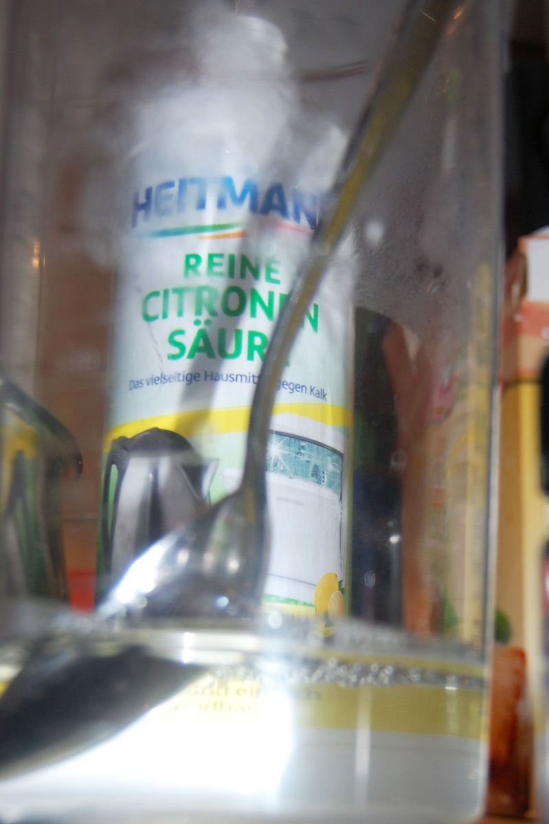2. Das abgekühlte Wasser habe ich dann mit 2 EL Citronensäure gemischt. Es geht auch mit frischem Zitronensaft. Auf keinen Fall mit heißem Wasser mischen, denn dann entsteht schwerlösliches Calciumcitrat.