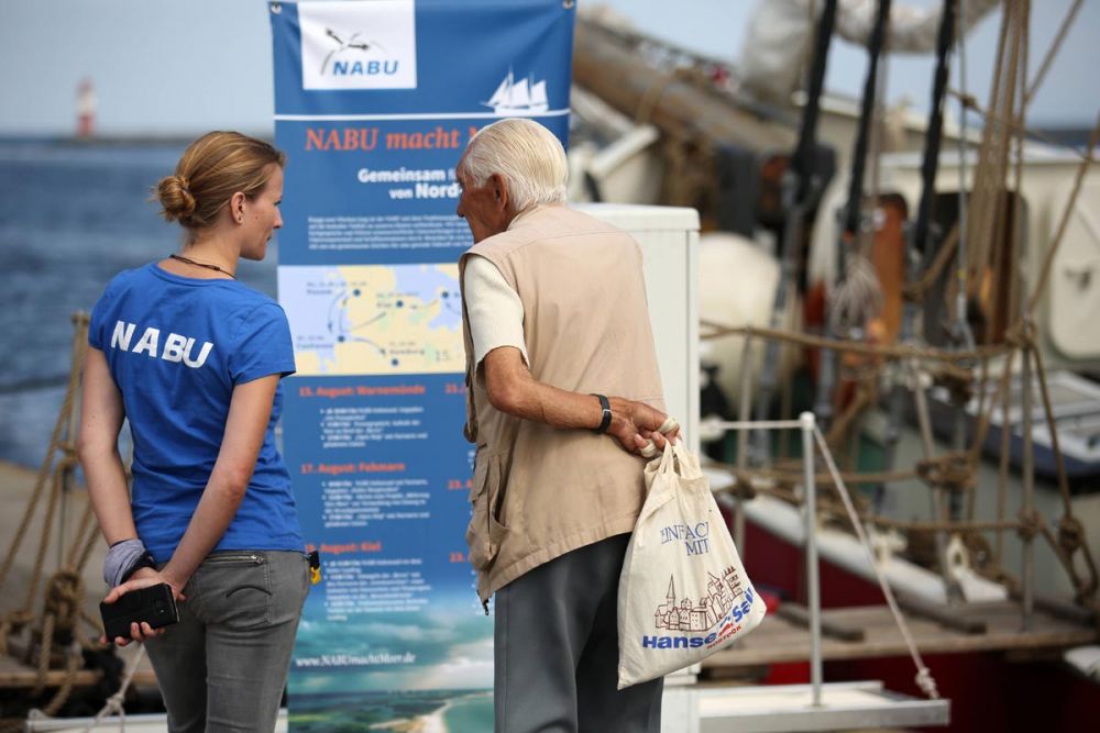 Anschließend statteten Vertreter aus der Politik der „NABU macht Meer“-Crew einen Besuch ab: So interessierten sich Reinhard Bütikofer (Vorsitzender der Europäischen Grünen) und Claudia Müller (Landesvorsitzende der Grünen in Mecklenburg-Vorpommern) beim „Open Shp“ für die Segeltour und ihr inhaltliches Anliegen – dem besseren Schutz der Meere. Im späteren Verlauf der Reise wird es zu diesen Themen noch öffentliche Podiumsdiskussionen geben, zu denen auch ihr eingeladen seid (und zwar in Kiel am 19. August und in Cuxhaven am 23. August).