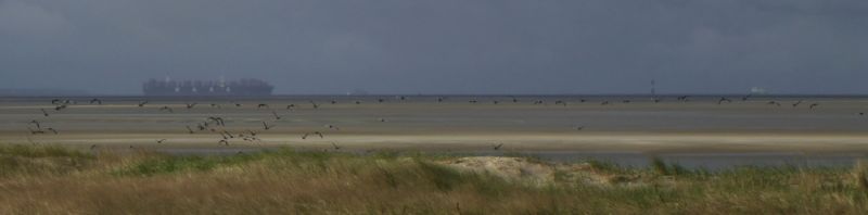 Seitdem der Wind gestern abflaute und auf westlich Richtungen drehte, hat der Heimzug der Weißwangengänse (oder auch Nonnengans genannt; Branta leucopsis) wieder Fahrt aufgenommen. Gestern zogen allein 1.893 über die Insel, aber noch deutlich mehr weiter im Süden. Heute konnte ich mindestens 10.700 Weißwangengänse zählen, die in langen Ketten- und Keilformationen die Elbmündung zwischen Cuxhaven und Scharhörn Richtung Dithmarschen überquerten und weiter nach Nordosten zogen. Einige flogen dabei, wie abgebildet, nur wenige Meter über dem Meer, die meisten aber mehrere zehn Meter hoch.