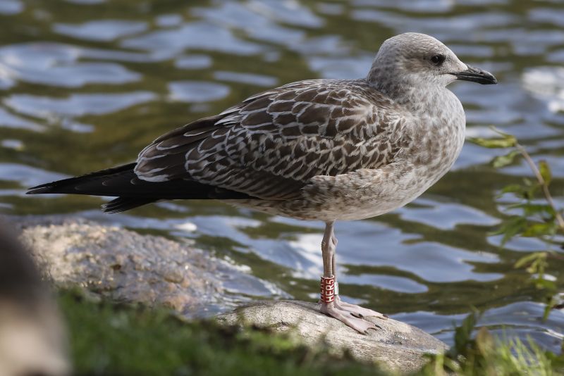 Um einen Überblick über den Bruterfolg dieser beiden Großmöwenarten zu bekommen, wurden in diesem Jahr 427 junge, noch nicht ganz flügge Möwen farbberingt und bei einem Kontrollgang erneut abgelesen. Anhand der in der Kontrolle gefundenen beringten und unberingten Jungmöwen lässt sich der Bruterfolg (also wie viele Jungmöwen pro Brutpaar flügge geworden sind) errechnen. Und das sieht dieses Jahr sehr gut aus! Inzwischen haben fast alle flügge gewordenen Jungmöwen Trischen verlassen und werden an den unterschiedlichsten Orten gesehen, abgelesen und gemeldet. Es ist schon spannend, auf diese Weise nachvollziehen zu können, wo die ein oder andere Möwe, die hier geschlüpft ist, hinfliegt. Einige wurden in Büsum gesehen oder in der Seehundstation in Friedrichskoog. Eine andere wiederum wurde aus Belgien gemeldet. Anfang September wurde dann mit einem sehr schönen Foto, das oben zu sehen ist, eine junge Heringsmöwe mit dem roten Farbring HER5 von Peder Winding in Schweden, mehr oder weniger mitten in Göteborg in einem großen Park abgelesen! Peder stellte mir das Foto netter Weise zur Verfügung. (Entfernung Slottskogen, Göteburg – Trischen 452 km Luftlinie)