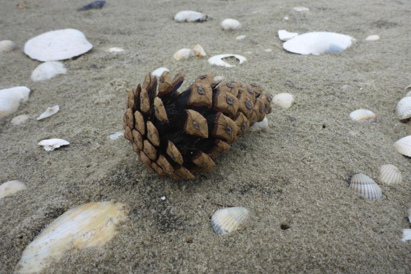 Nach längerer Durststrecke wird die Vitaminversorgung aus dem Meer wieder besser: ein frischer Apfel wurde angespült, womöglich ein erster von heimischem Baum? Auch ein weiterer Appel ist gestrandet, leider nicht so nahrhaft und sehr holzig: ’n Kienappel (Platt für Kiefernzapfen).