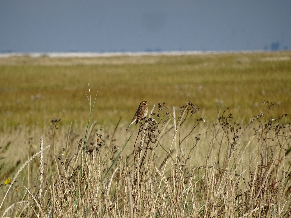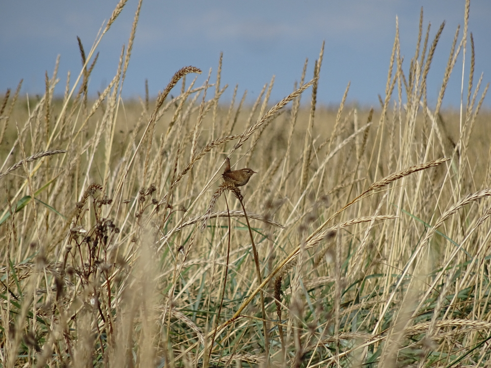 In der hohen Dünenvegetation und im Schilf kann man im Moment einiges beobachten. Da sind zum Beispiel Rohrammern (Emberiza schoeniclus), Wiesenpieper (Anthus pratensis) oder Zaunkönige (Troglodytes troglodytes), die sich dort verstecken. Ich versteckte mich heute ebenfalls für einige Zeit in der Düne um diese kleinen Vögel zu beobachten. Vor allem der Zaunkönig ist ein wunderfiziger Geselle: kaum verhielt ich mich etwas ruhig, da kam er aus seinem Versteck und setzte versuchte sich auf den dünnen Halmen des Strandhafers so weit oben wie möglich zu positionieren. Laut und charakteristisch schimpfte er mich aus. Auch die Rohrammer ließ sich nach kurzer Zeit blicken. Die Wiesenpieper sind dagegen etwas scheuer und fliegen sehr leicht auf. Dementsprechend viel Geduld musste ich für das Bild aufbringen.