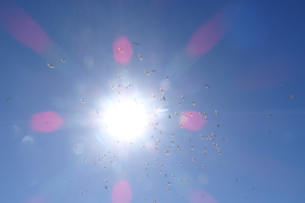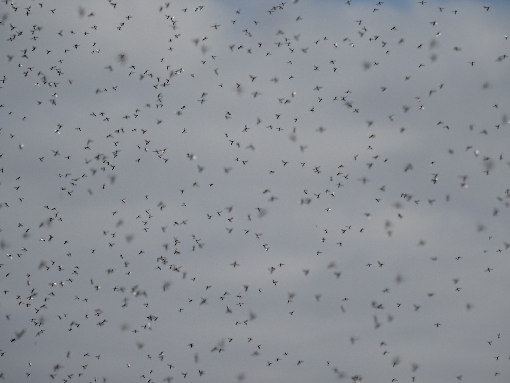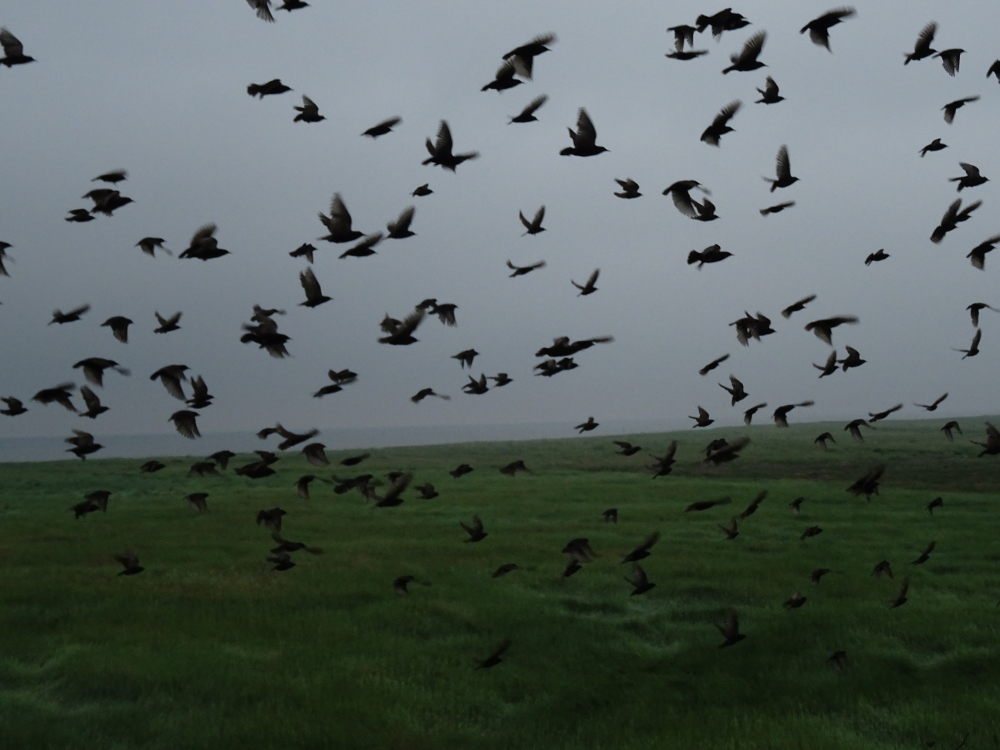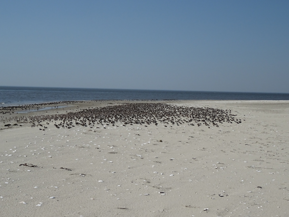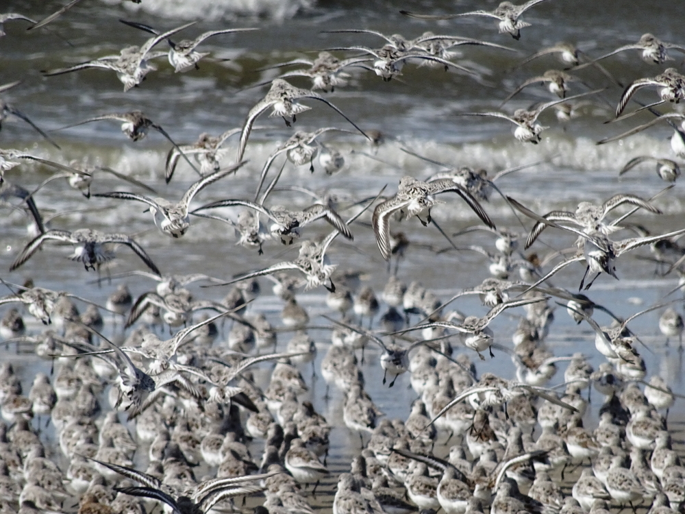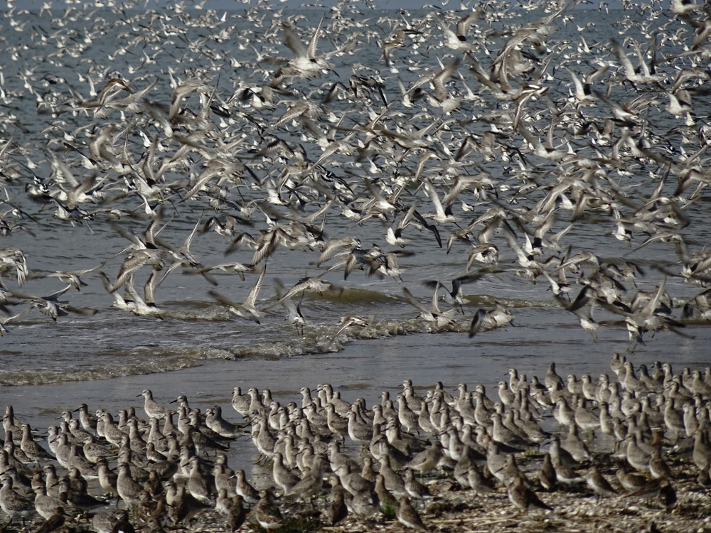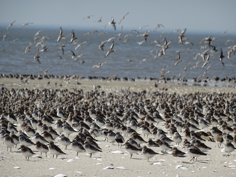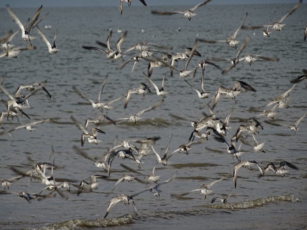 Mittags waren einige tausend Knutts (Calidris canutus), die zusammen mit Sandregenpfeifern (Charadrius hiaticula), Alpenstrandläufern (Calidris alpina) und Sanderlingen (Calidris alba) und Steinwälzern (Arenaria interpres) einen Rastrupp bilden, am Weststrand zu beobachten. Es ist einfach beeindruckend, wie perfekt sich die einzelnen Vögel zu einem großen Vogelschwarm zusammenfügen können -ohne, dass es zu Zusammenstößen oder Unfällen kommt fliegen sie waghalsige Manöver und bieten dem Betrachter eine atemberaubende Choreographie.