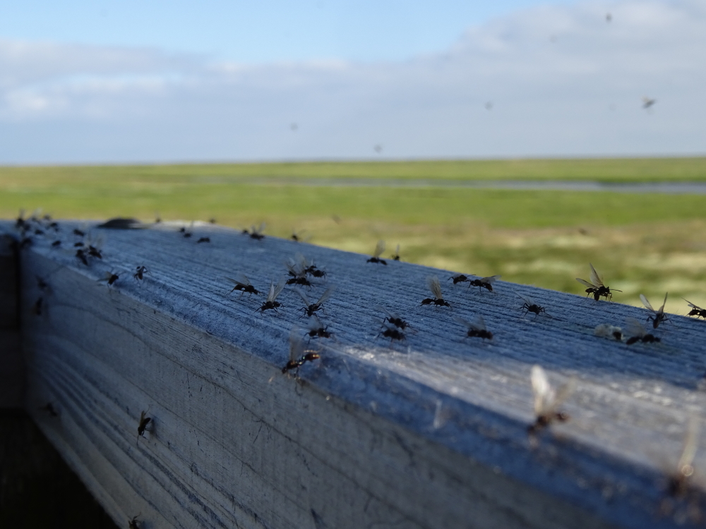 Heute überflogen in den ersten Minuten nach Sonnenaufgang (gegen 7:00 Uhr) etliche Buchfinken (Fringilla coelebs) die Insel. In den Tagen zuvor beobachtete ich noch deutlich weniger Finken, dafür mehr Wiesen- und Baumpieper. Heute waren auch Rotkehlchen (Erithacus rubecula) und ein Zaunkönig (Troglodytes troglodytes) „zu Besuch“ auf meinem Hüttengeländer. Auch einige Graugänse (Anser anser), drei Graureiher (Ardea cinerea) und rund zwanzig Krickenten (Anas crecca) beobachtete ich am Morgen.