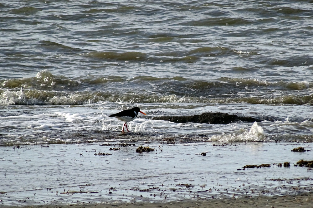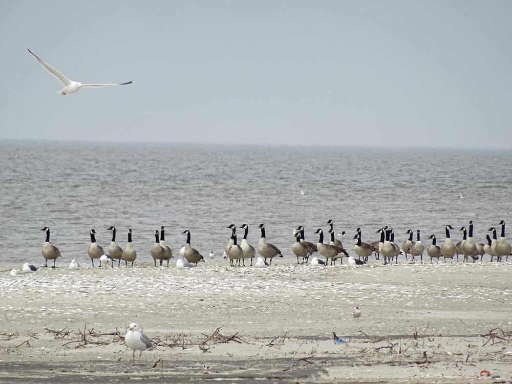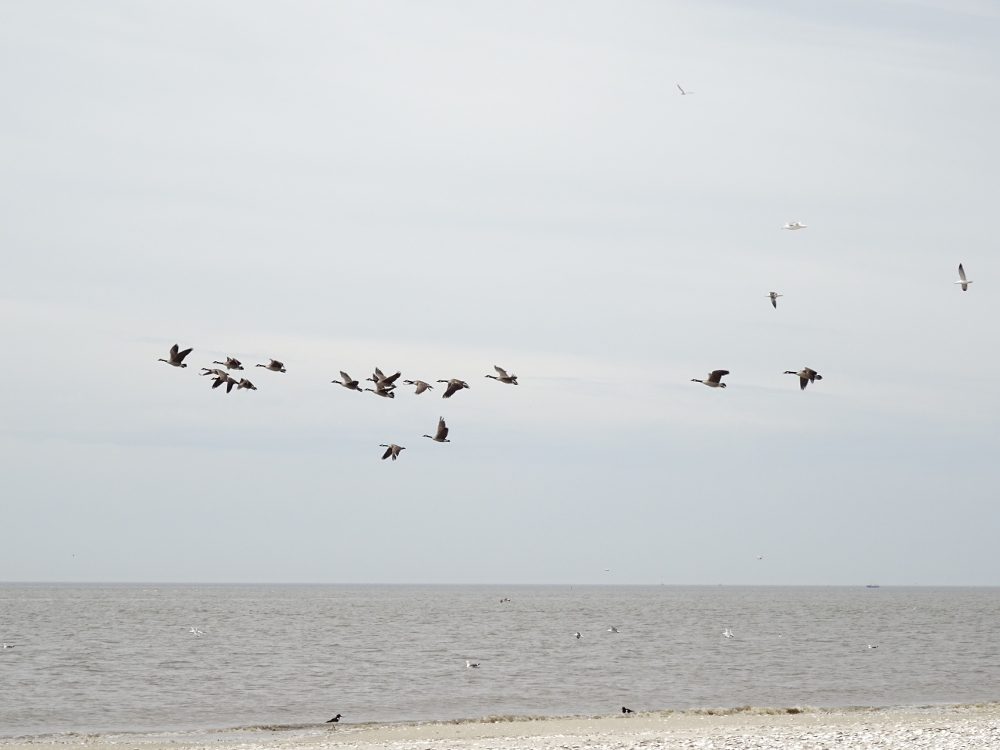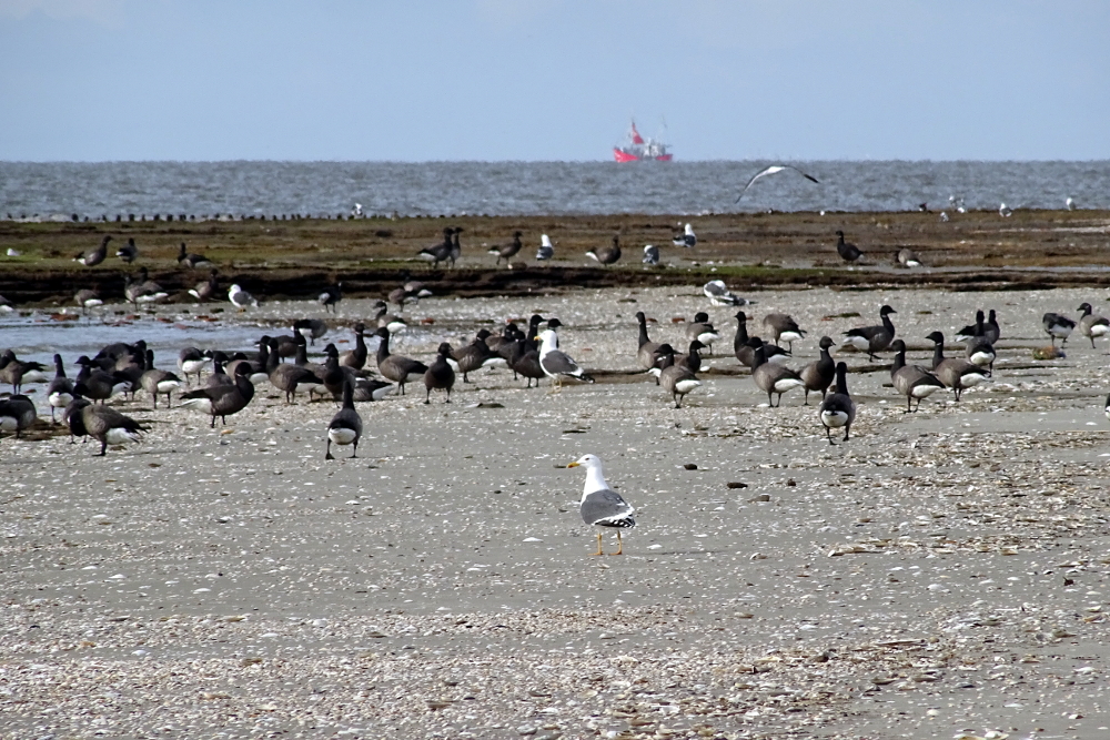 Am Strand: einige hundert Ringelgänse, Mantelmöwen, Silber- und Heringsmöwen, Lachmöwen, vier Sandregenpfeifer, Austernfischer und einige Graugänse.