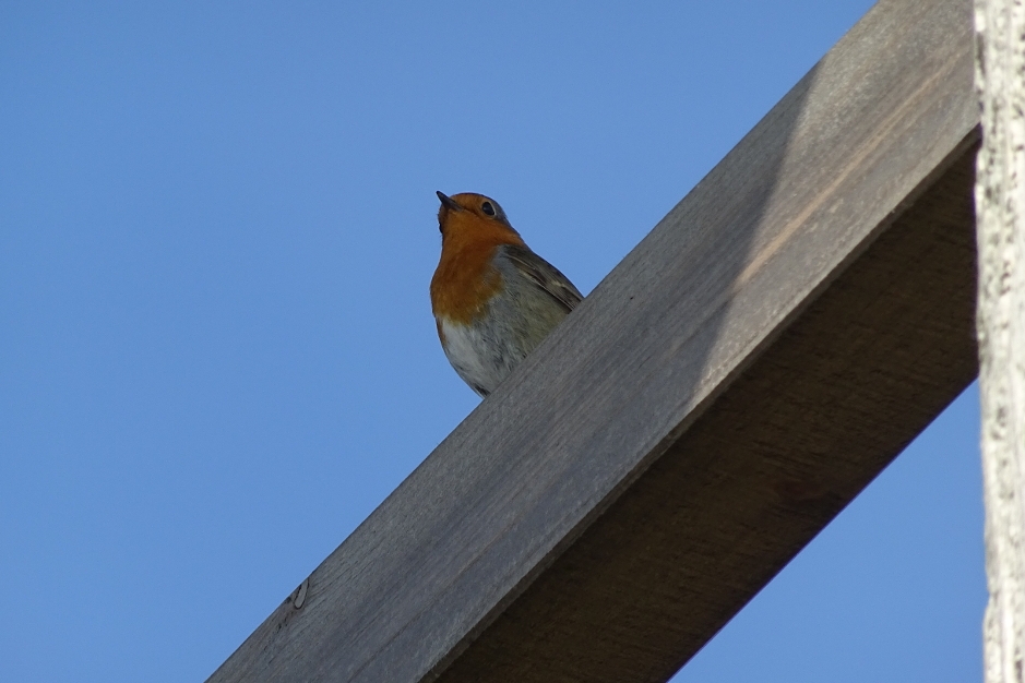 Das Rotkehlchen zeigt ein ausgeprägtes Revierverhalten: es scheucht rastende Vögel in der Nähe der Hütte auf.