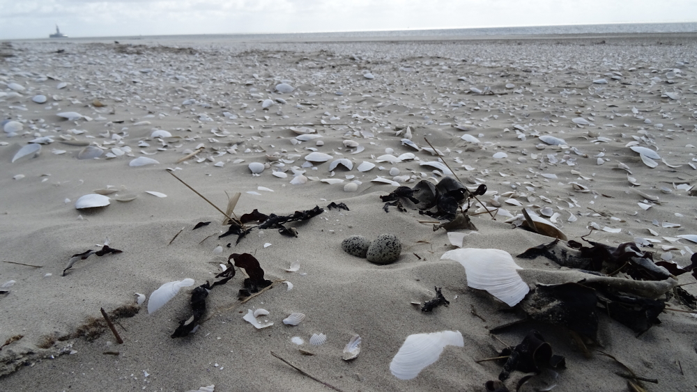 Bei einem kurzen Strandspaziergang habe ich in direkter Nähe zum Strandübergang das erste Gelege der Sandregenpfeifer (Charadrius hiaticula) entdeckt. Schon seit ich auf der Insel bin, habe ich die zwei Sandregenpfeifer im Verdacht gehabt, bald „loszulegen“. Nun ist der erste Brutnachweis erbracht: ein Teilgelege, mitten am Strand.