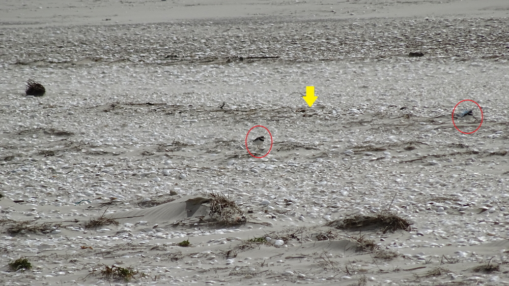 Schon nach ganz kurzer Zeit kehrten auch beide Altvögel in die Nähe des Nestes (gelber Pfeil) zurück, sodass ich davon ausgehe, dass sie das Gelege in Kürze voll machen werden und ihr Glück am Strand von Trischen versuchen werden.