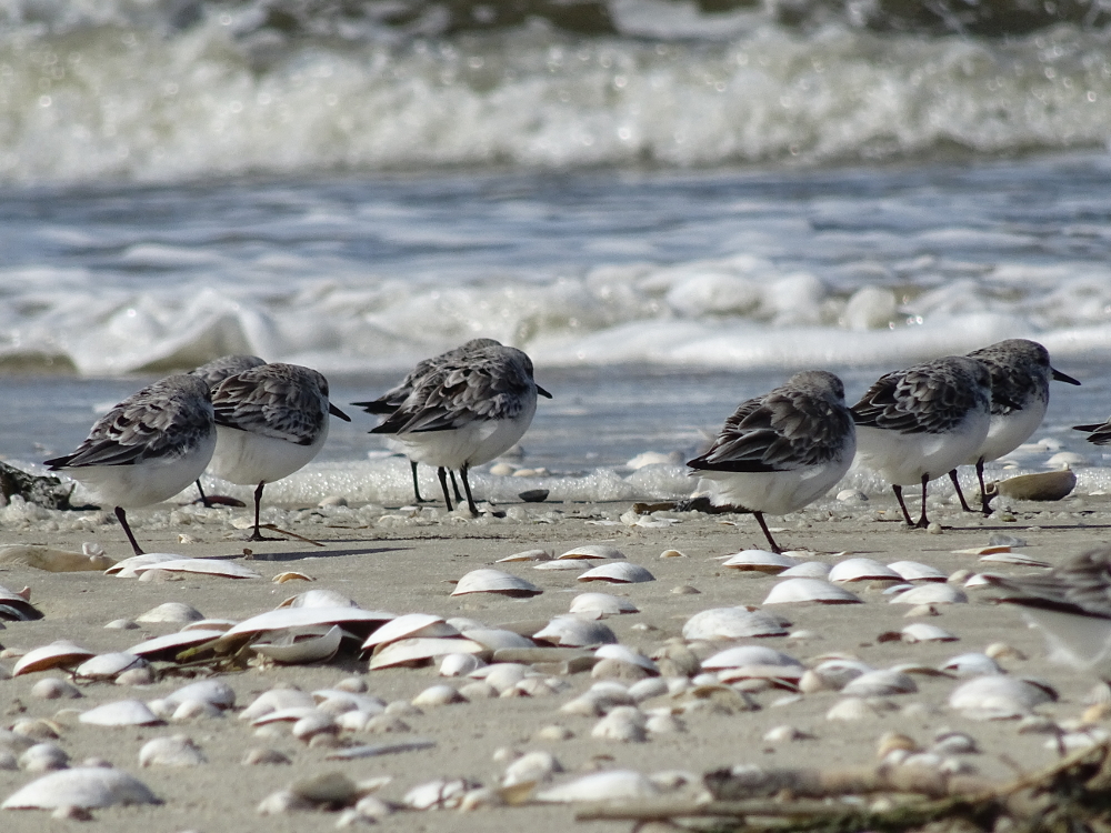 Am Strand versammeln sich immer mehr Sanderlinge (Calidris alba). Bei der letzten Strandrunde konnte ich mehrere hundert Individuen, eng zu einer Gruppe zusammenstehend, direkt an der Wasserkante beobachten. Anders als viele anderen Vogelarten auf Trischen, scheinen die Sanderlinge sich von mir nicht so schnell aus der Ruhe bringen zu lassen.