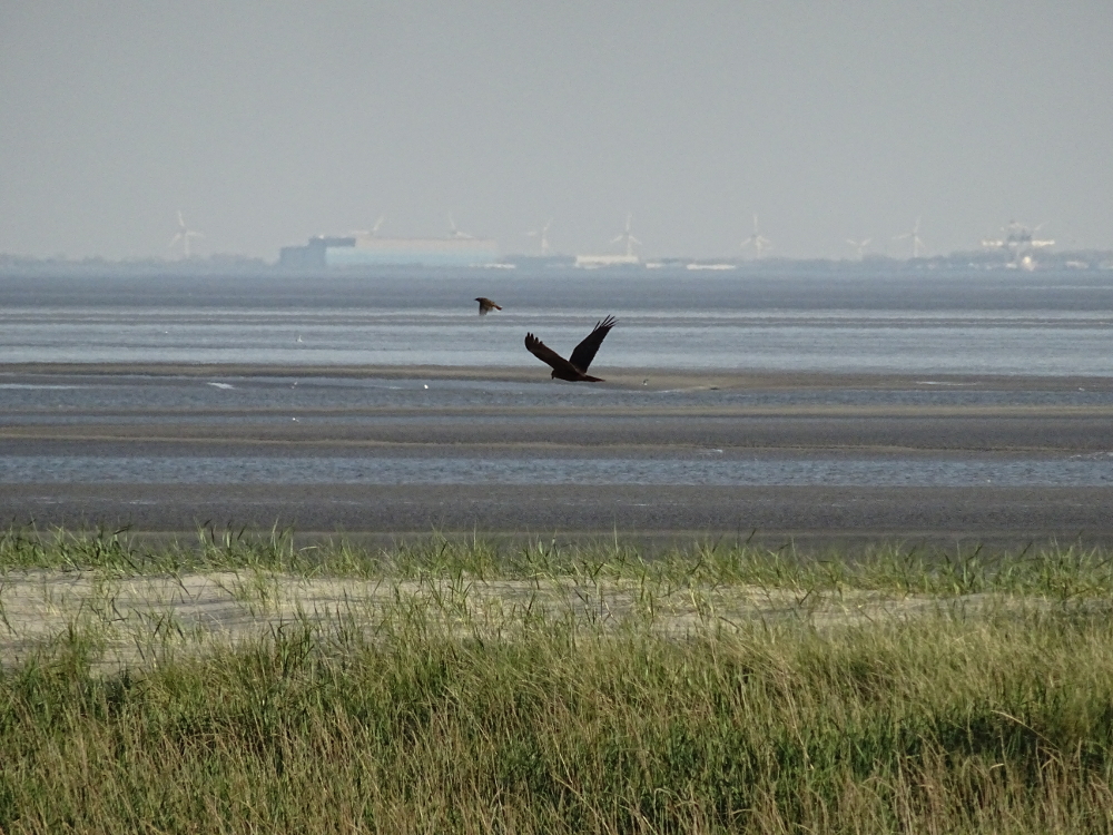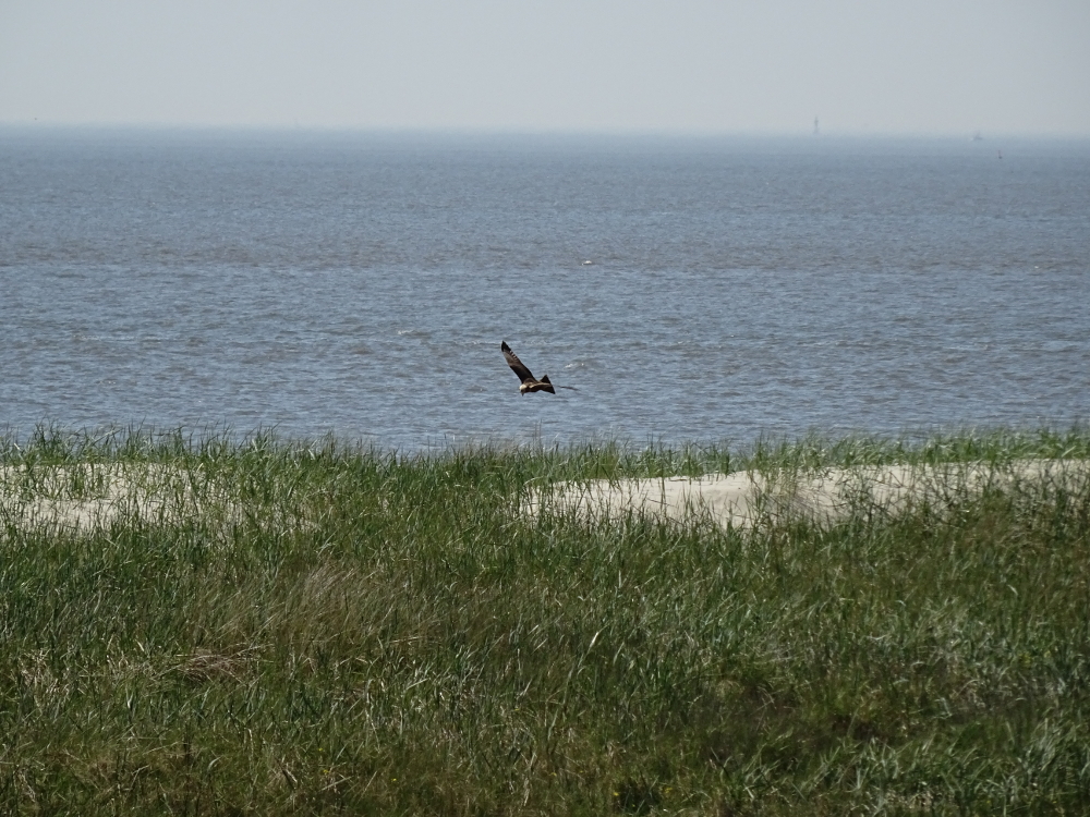 Seit zwei Tagen kann von der Hütte eine weibliche Rohrweihe (Circus aeroginosus) beim jagen beobachtet werden. Sie fliegt mehrmals am Tag die Dünenkette bis zum Südstrand hinunter und versucht kleine Vögel zu erbeuten. Nicht selten wird sie dabei von Brandgänsen, Rotschenkeln oder sogar Wiesenpiepern attakiert und vertrieben. Ich bin sehr gespannt wie sich diese Geschichte weiterentwickelt. Vielleicht beginnt sie hier zu brüten? Am 5. Mai konnte ich zwei Rohrweihen (ein Männchen und ein Weibchen) im Verbund jagend über dem nördlichen Teil der Insel beobachten.
