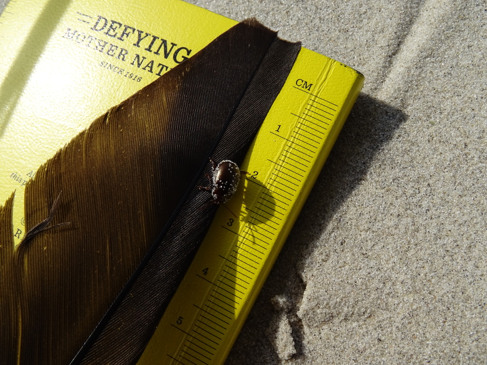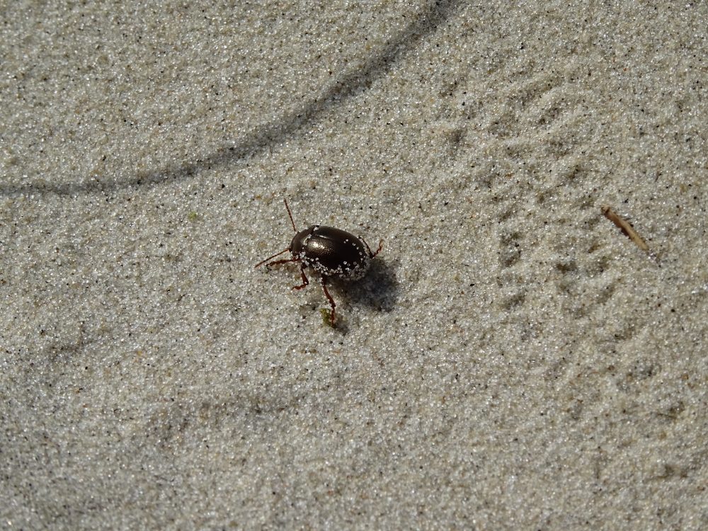 Am Dünenübegang entdeckte ich ein Exemplar des Rotbraunen Blattkäfers (Chrysolina staphylaea). Normalerweise kommt dieser Käfer an Gewässerrändern oder Feuchtwiesen vor – bei mir scheinbar auch im Dünental. Der ganze Körper des Käfers ist rotbraun gefärbt, was ihm den deutschen Namen einbrachte. Zudem ist die Oberseite ist überall fein punktiert.