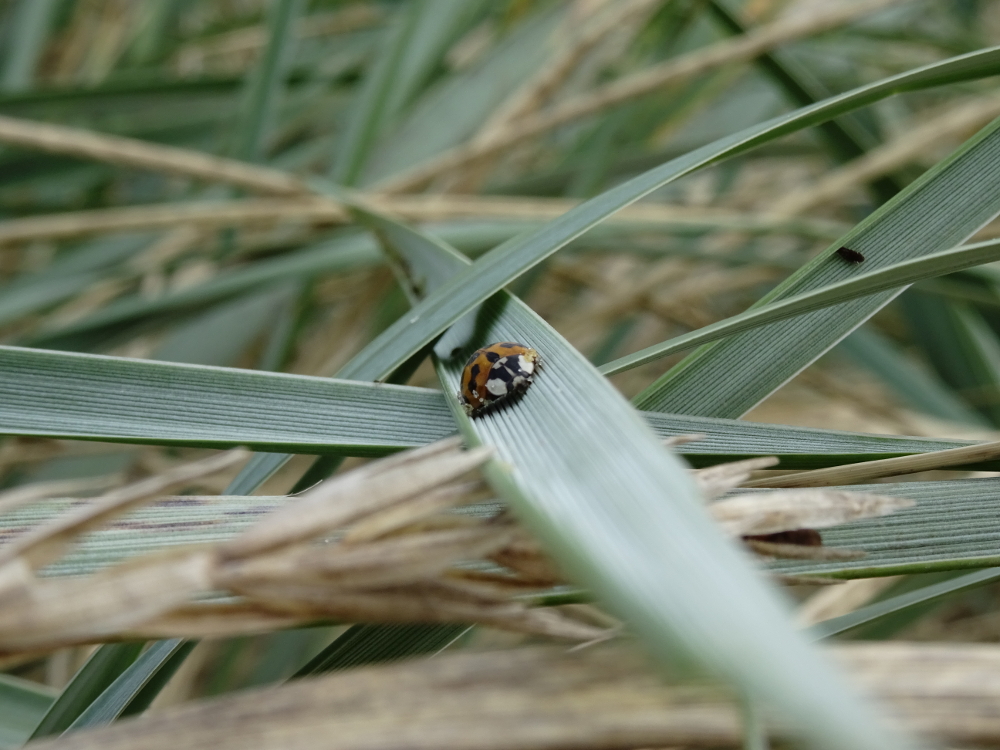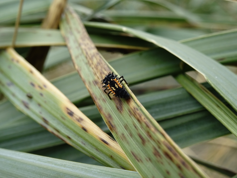 Während ich so in der Düne saß und mich versteckte, fiel mir ein ganz anderer Geselle auf: ein Asiatischer Harlekin-Marienkäfer. Er krabbelte fröhlich auf dem Halm herum. Ganz in der Nähe fand ich die dazugehörige Larve: in wenigen Wochen wird auch dieses Tier voll entwickelt sein und wie sein Vorgänger durch die Düne krabbeln. Denn die Entwicklung eines Marienkäfers dauert insgesamt nur rund drei Wochen. Das könnte er also noch schaffen.