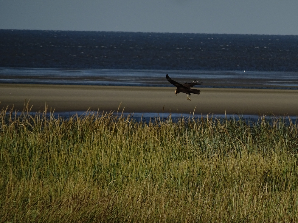 - eine weibliche Rohrweihe (Circus aeruginosus) flog einge Male über die Hütte