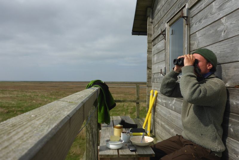 Es ist das erste Wochenende im Mai. Das bedeutet für viele Vogelbegeisterte: bis zu 24 Stunden wach sein, Augenringen vom ständigen Durchs-Fernglas-Gucken und etliche Kilometer zu Fuß, mit Fahrrad oder sonstigen Verkehrsmitteln. Denn an jedem 1. Samstag im Mai ist „Birdrace“. In diesem vom Dachverband Deutscher Avifaunisten (DDA) organisierten Wettbewerb geht es darum innerhalb von 24 Stunden so viele Vogelarten wie möglich zu sehen. Und eigentlich in Teams von zwei bis fünf Personen, von denen die Mehrheit der Teammitglieder den entsprechenden Vogel gesehen haben muss. Und da man hier sowieso die ganze Zeit mitten unter den Vögeln ist und nach ihnen schaut, gab es natürlich auch ein Trischen-Team. Nun mag der aufmerksame Leser stutzen: Lebt der Vogelwart nicht alleine auf der Insel? Ja, das stimmt. Aber extra fürs Birdrace habe ich meine Freunde Robinson Crusoe und Hauke Freitag für einen Tag eingeladen und so konnte auch hier ein Team an den Start gehen.