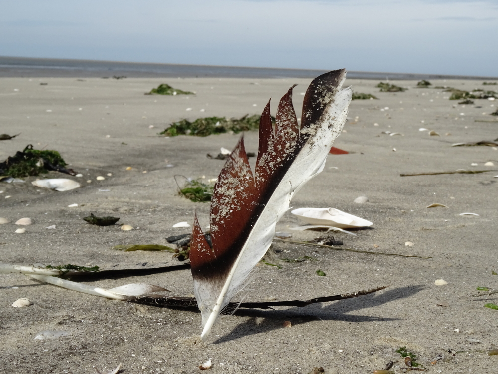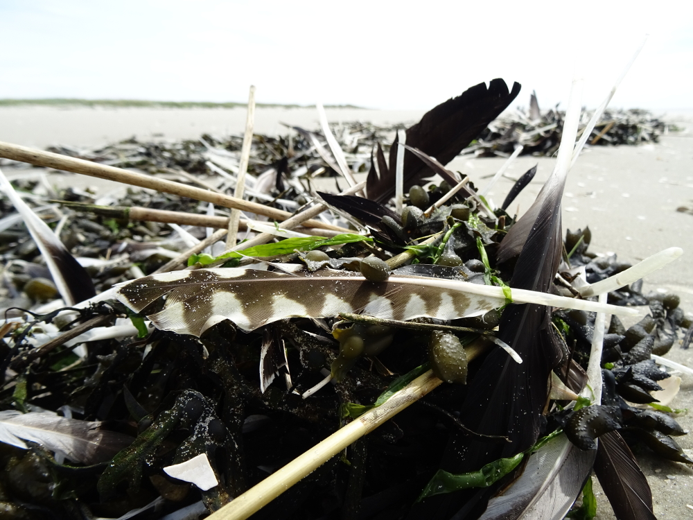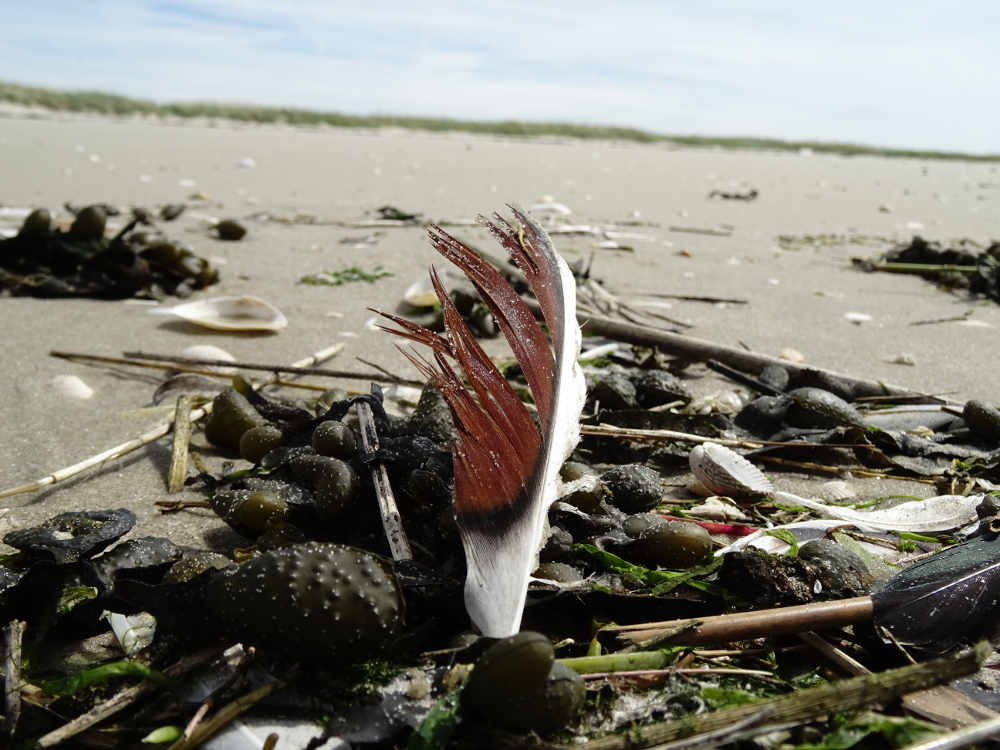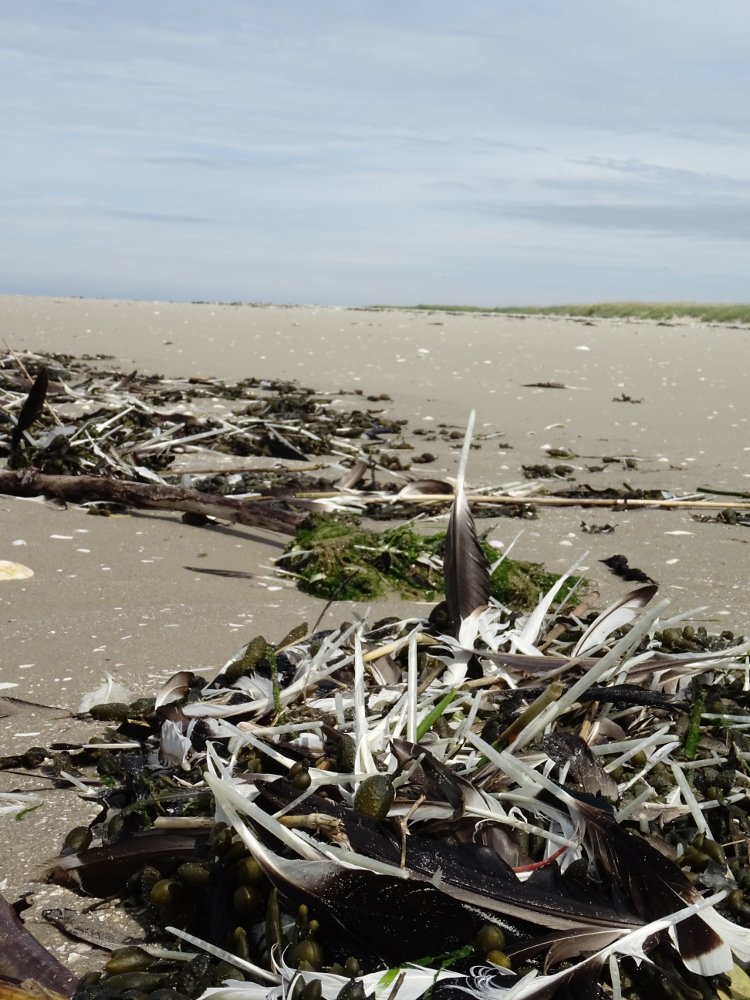 Schon jetzt ist die Mauser jedoch nicht zu übersehen: Am Strand türmen sich die abgelegten Federn im Spülsaum und bilden zum Teil sehr hübsch anzusehende Formationen.