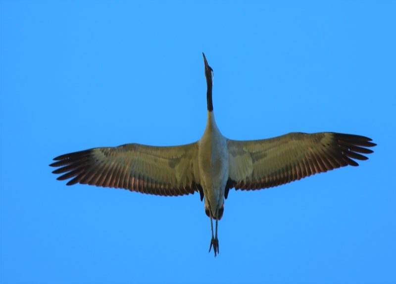 Am Mittwoch kreiste er eine ganze Weile über der Insel in der Thermik, sodass fast alle Fotos „kopfüber“ entstanden sind. Sehr schön sieht man aber so die beeindruckende Färbung und Musterung der großen Kranich-Flügel.