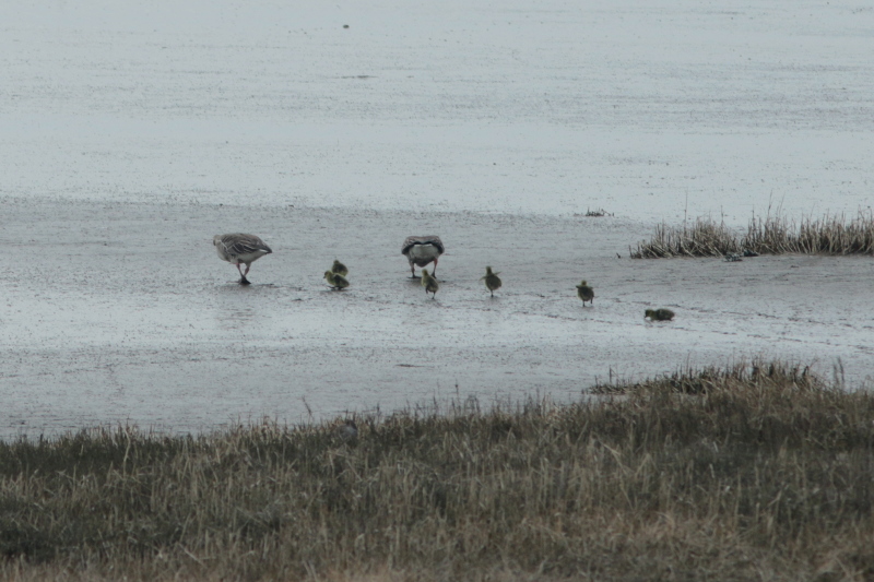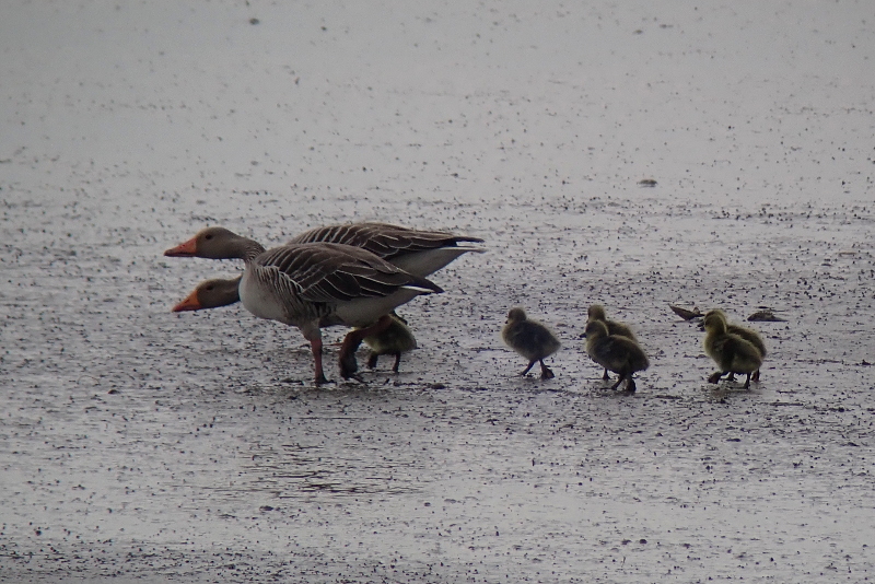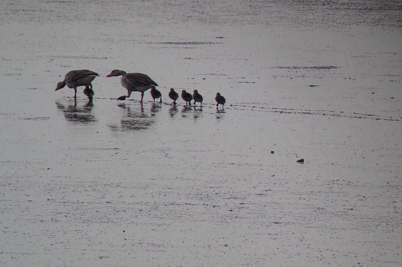 Wie auch auf anderen Inseln und Halligen üblich wandern die Graugänse mit ihren noch kleinen Gösseln ab und machen sich auf den Weg Richtung Festland. So wollte dieses Paar möglicherweise die kommende Flut abwarten, um mit der umkehrenden Strömung des Flackstroms die Schnellstraße zum Festland zu nutzen.