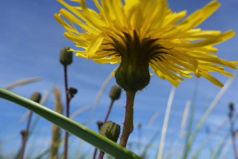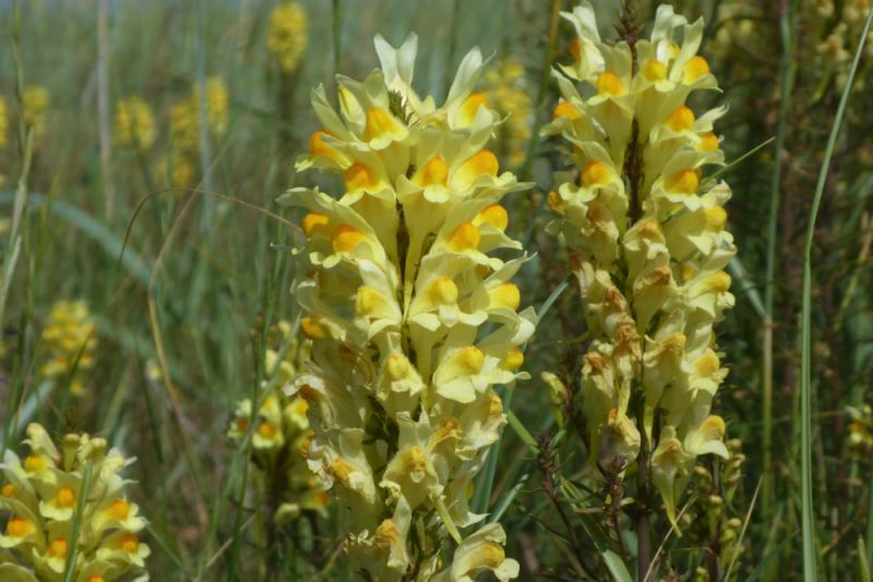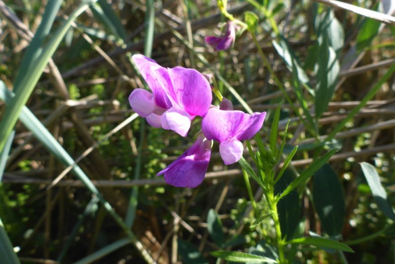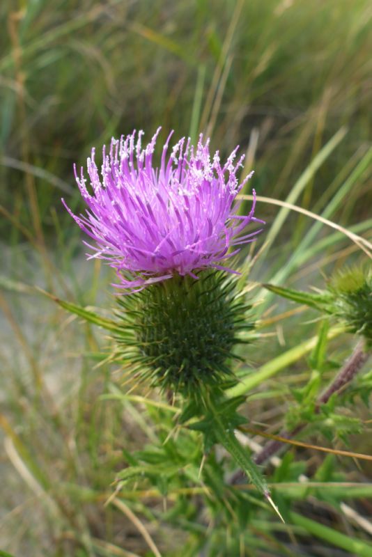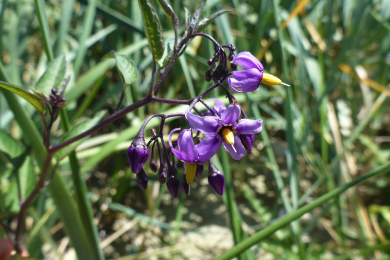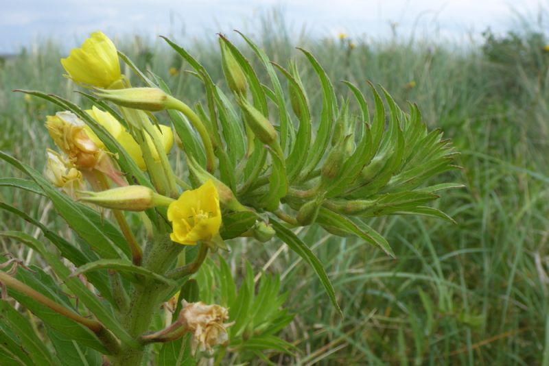 In Grau- und Weißdüne wird es richtig bunt. Zwar dominiert flächenmäßig gelb als Blütenfarbe, durch die Sand-Nachtkerze (Oenothera oakesiana), Acker-Kohldistel (Sonchus arvensis) und das Gewöhnliche Leinkraut (Linaria vulgaris), aber es finden sich zahlreiche violette und blaue Tupfer. An feuchteren Stellen blüht zum Beispiel der Bitter-süßem Nachtschatten (Solanum dulcamara) blau-violett und an trockeneren sind ein paar Disteln zu finden, so die Lanzett-Kratzdistel (Cirsium vulgare). Die genannten Arten sind typisch für Dünen, aber nicht auf sie beschränkt. So findet man sie (bzw. bei der Nachtkerze nahe Verwandte) auch im Binnenland. Die violette blühende Strand-Platterbse (Lathyrus japonicus subsp. maritimus) findet man dagegen nur in Weiß-Dünen und sie ist entsprechend selten.