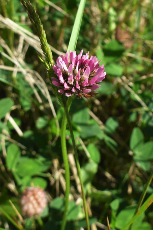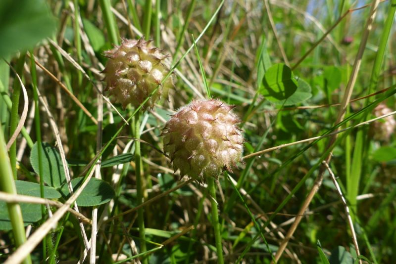 In der oberen Salzwiese finden wir schließlich noch eine Besonderheit: den ebenfalls rot blühende Erdbeerklee. Er verdankt seinen Namen aber weniger von den roten Blütenständen, sondern eher den Fruchtständen, die sich zur Fruchtreife vergrößern, kugelig werden und an Erdbeeren erinnern. Sie sind jedoch trockenhäutig und nicht fleischig.