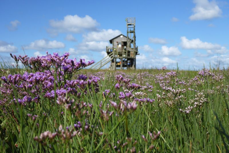 Die violetten Teppiche bedecken nun große Teile der oberen Salzwiese und werden aus den Blütenständen des Strandflieders (Limonium vulgare) gebildet. Es ist eine typische und vielleicht die bekannteste Salzwiesenpflanze. Auf den Halligen in Nordfriesland sind sie auch als Halligflieder bekannt. Die attraktiven violetten Blüten sind trockenhäutig und zerfallen beim Trocknen nicht, worauf wohl auch der Name „Ewigkeitsbloom“ zurückgeht. Sie waren daher früher als Trockenblumen sehr beliebt, was die Bestände stark dezimiert hat. Das Sammeln in der Natur ist nicht mehr erlaubt, so dass sich nun wieder alle Besucher des Wattenmeers am Blütenmeer im Sommer erfreuen können.