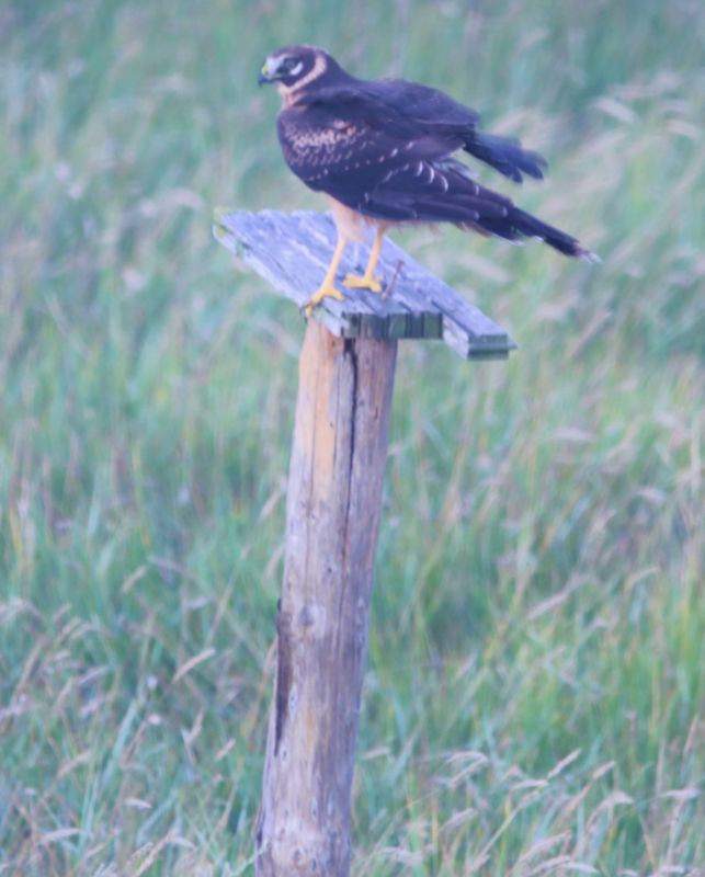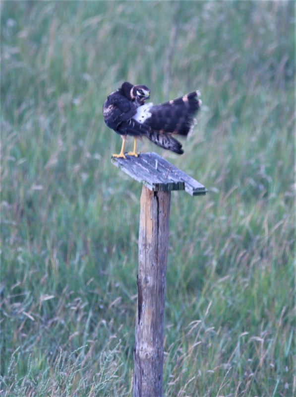 Am nächsten Morgen während der Zugplanbeobachtung zeigte sich das gleiche Schauspiel! Wieder ein diesjähriger Steppenweihe, wieder zunächst über den Dünen. (Vielleicht handelte es sich um das gleiche Individuum wie am Vortag, vielleicht aber auch nicht. Das kann man nie so genau wissen) Doch an diesem Morgen wurde die Jagd ein wenig intensiver betrieben und die Weihe schoss immer wieder tief an der Hütte vorbei. Und was sehe ich da, diese Steppenweihe machte irgendwann eine kleine Jagdpause und flog den Pfosten westlich der Hütte an. Für wenige Sekunden setzte sie sich, machte eine äußerst kurze Gefiederpflege und weiter gings. Während man bei adulten, erwachsenen Steppenweihen die Geschlechter am Gefieder sehr gut unterscheiden kann, ist dies bei den Jungvögeln etwas schwieriger. Auf Grund der Iris, die für mich eher hell und gräulich aussieht, wage ich vorsichtig die Vermutung, dass es sich hierbei um ein Männchen handelt.