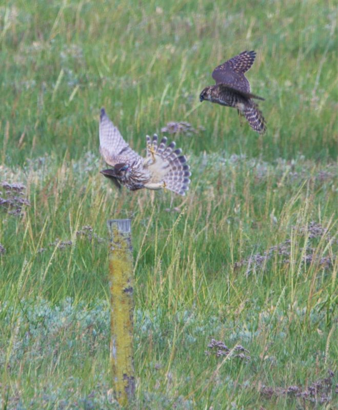Am späten Mittag machte die Steppenweihe den Osten der Insel unsicher und scheuchte die Großen Brachvögel auf. Der Merlin hingegen bekam Gesellschaft von einem zweiten. Allerdings verstanden sich die beiden nicht sehr gut und zankten um den Sitzposten. War das alles aufregend!