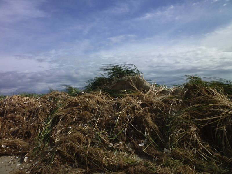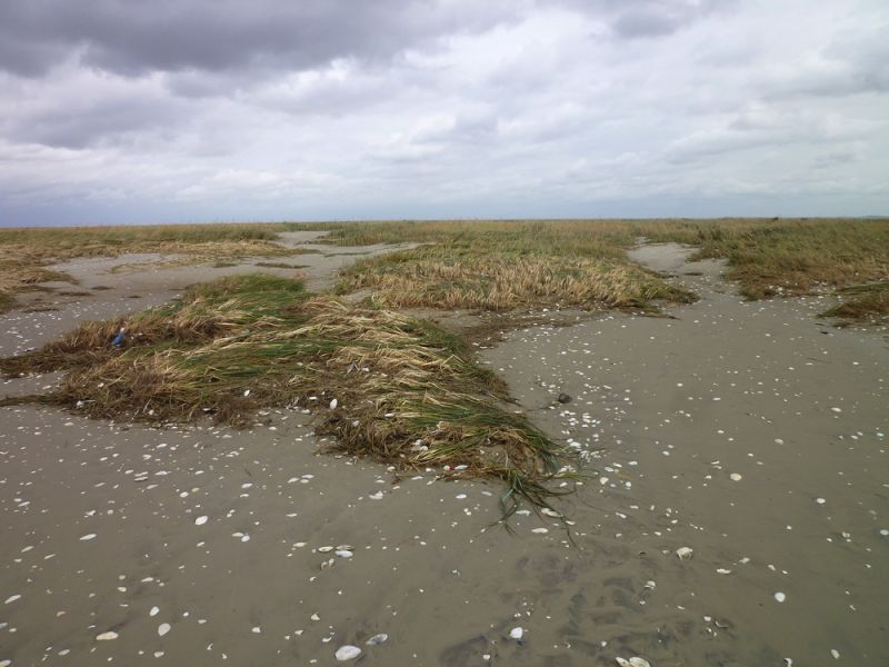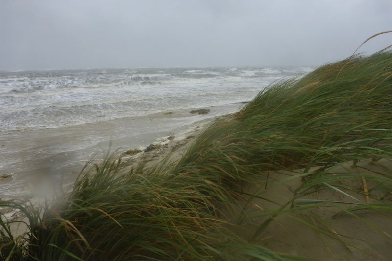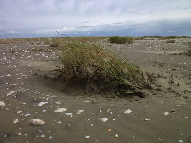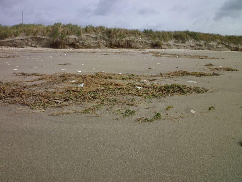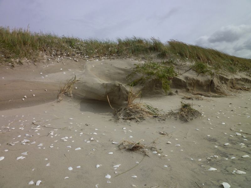 Weiter im Norden ist der Sand, der hier auf die Düne geweht worden war und sie erhöht hat, bis auf wenige Stellen weggespült worden. So liegen die Dünengräser nun wieder platt am Boden und zeigen ihre bleichen Stiele, welche vorher noch im Sand steckten. Überall hängen Muscheln und anderes Treibgut auf der Düne und an einigen Stellen wurden Sandfächer über die Düne gespült.