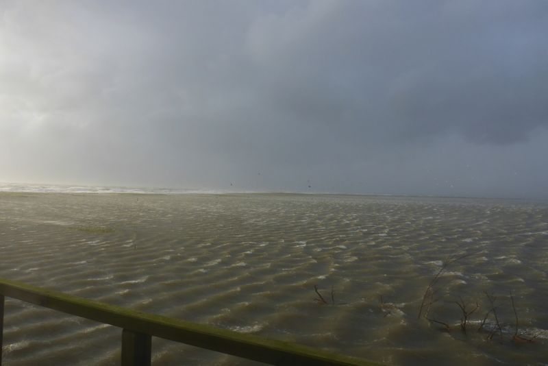 Am Mittwoch fiel das Barometer dann noch weiter und zeigte schließlich 992 hPa, der bislang niedrigste Wert der Saison. Auch der Wind nahm beständig zu, zerrte und ruckelte an der Hütte. Büsum meldete schließlich als Spitzenböe 130 km/h, händisch konnte ich hier immerhin 113 km/h messen.