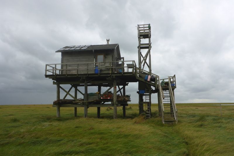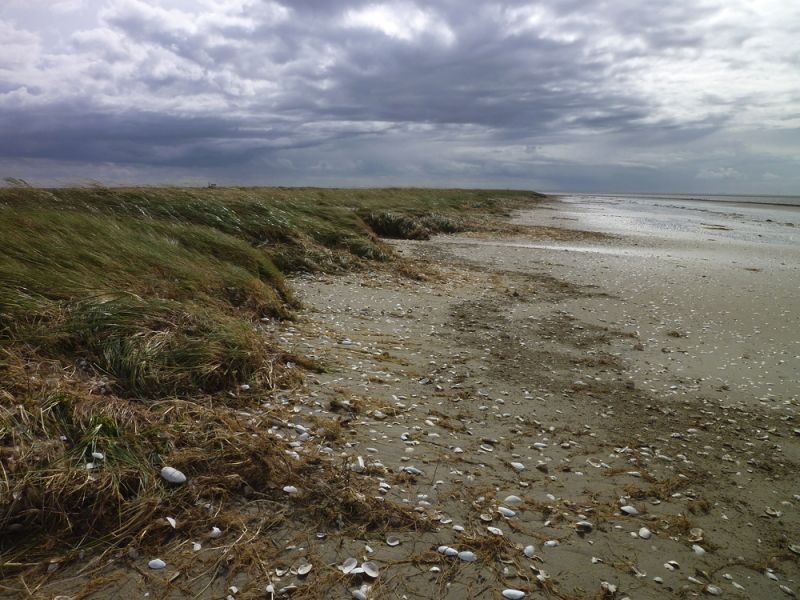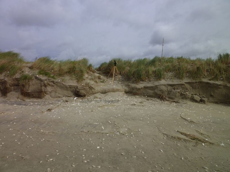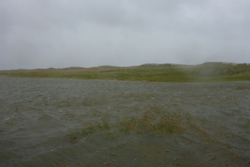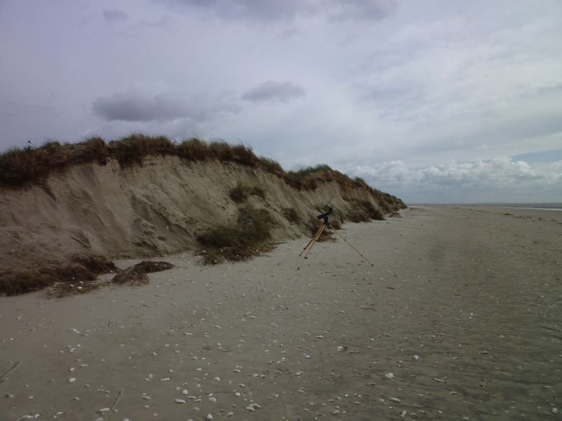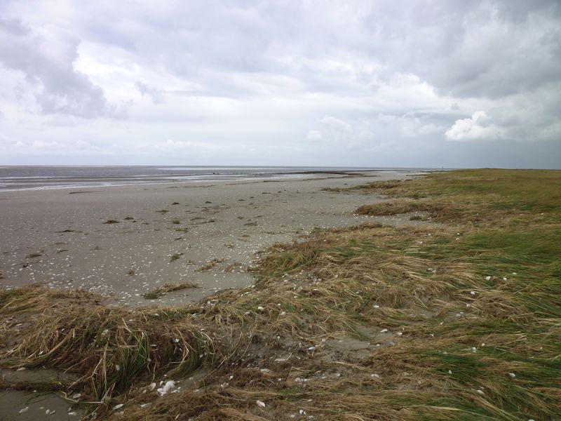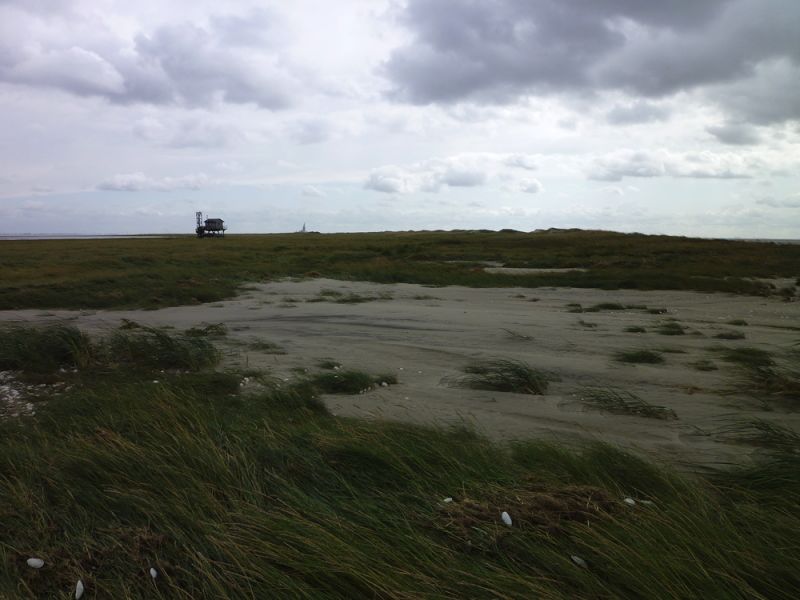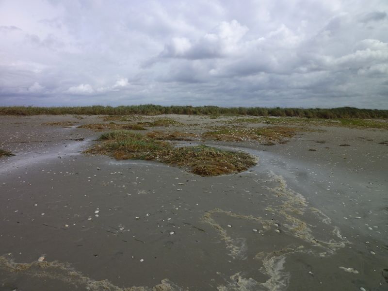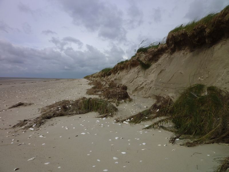 Abends nahm der Wind dann gücklicherweise wieder ab und auch der Wasserstand sank langsam aber stetig. Heute konnte ich dann die Sturmschäden begutachten. Die Hütte hat alles gut überstanden. An den Dünen sind aber deutlich die Spuren der Sturmflut zu erkennen. Die hohen Dünen im Süden der Insel sind jetzt wieder so steil wie bei meiner Ankunft. Die Vordünen, die im Verlauf ders Sommers aufgeweht worden waren, sind weggepült und die Salzmieren liegen wieder frei auf dem Sand.