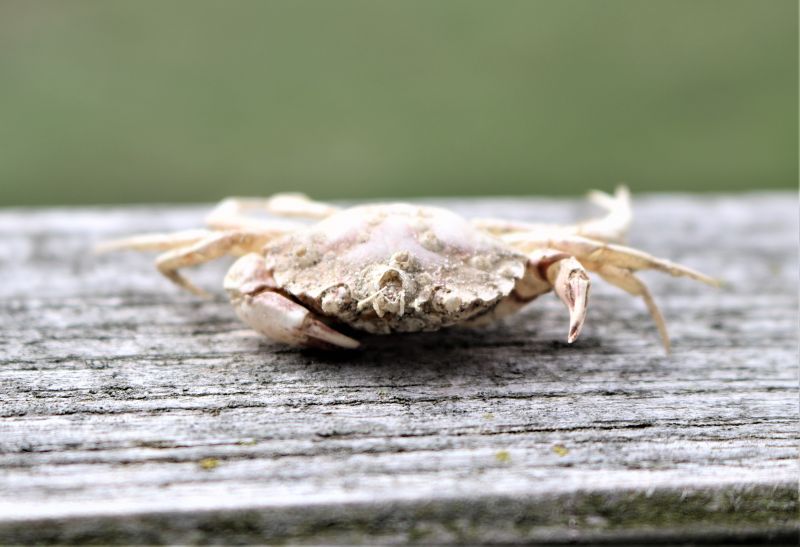 Aber dies ist nur der alte Panzer einer Strandkrabbe. Sie ist weich und lebend aus dieser Hülle geschlüpft und hat einen neuen Panzer gebildet. Diese Fähigkeit der Krebstiere finde ich immer wieder neu faszinierend. Ihr Problem ist nämlich, dass ihr Panzer nicht mitwächst. So wie wir aus unserer Kleidung wachsen, wächst die Strandkrabbe aus dem Panzer, der sie schützt. Da muss eben von Zeit zu Zeit das Kleid gewechselt werden. Der Panzer platzt an der Rückseite auf und die weiche Strandkrabbe schlüpft hinaus. Sie vergräbt sich zunächst im Watt um vor Fressfeinden in diesem „nackten“ Zustand geschützt zu sein. Es bildet sich ein neuer, größerer Panzer, und weiter geht’s. Falls ihr zuvor eventuell ein Bein oder eine Schere abhanden gekommen ist, ist die Zeit der Häutung auch die Zeit der Nachbildung. Zunächst noch etwas klein, entwickelt sich das fehlende Gliedmaß einfach neu.