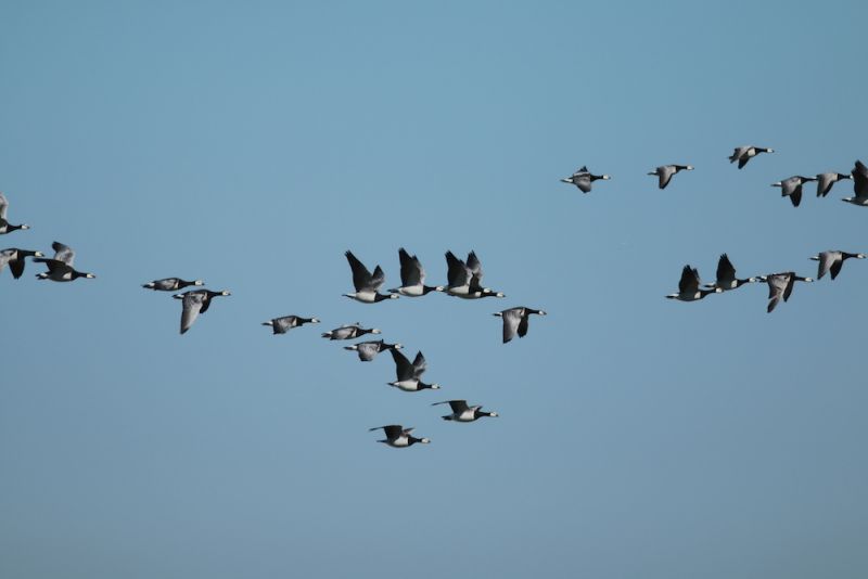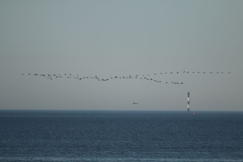Lange, mehr oder weniger zusammenhängende Ketten aus Formationen ziehender Weißwangengänse (Branta leucopsis) spannen sich wie ein Netz über den Himmel. Die letzten Tage war über Trischen ein spektakuläreres Massenzugereignis dieser nordischen Gänse zu beobachten.