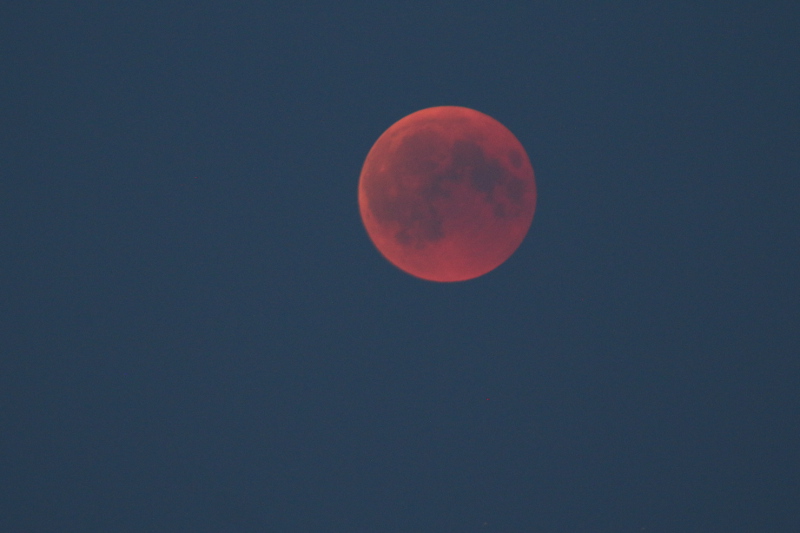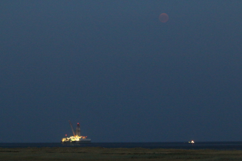Erst um kurz vor halb 11 entdeckte ich den bereits beschattet aufgegangenen Mond über der hell erleuchteten Ölbohrinsel Mittelplate A. Er schien in einem blassen Rot und wirkte fast durchsichtig. Je dunkler es wurde, desto kräftiger schien der Blutmond.