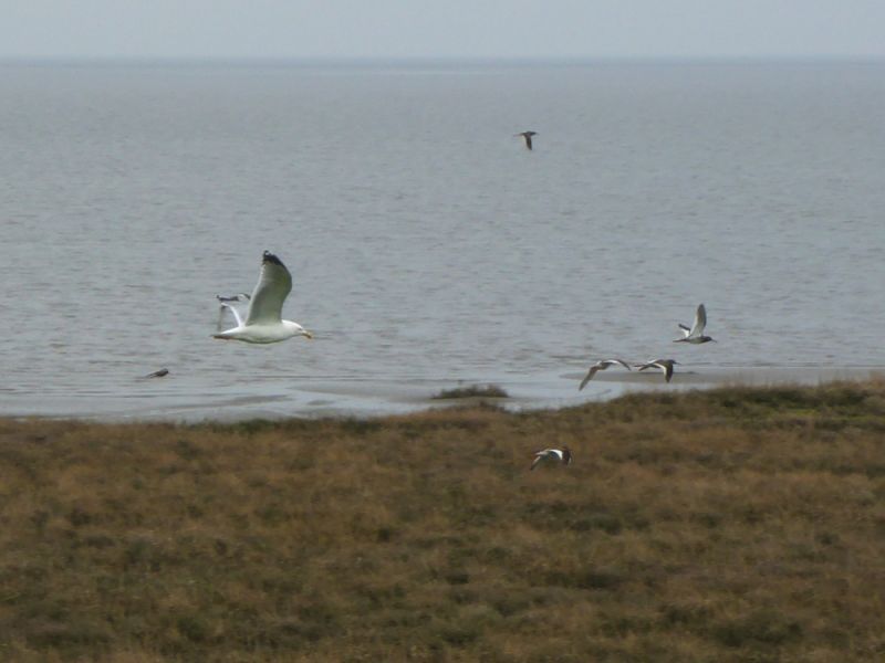 Auch die Möwen haben nicht mehr viel zu spaßen. Wehe, eine fliegt ein wenig zu tief über die Salzwiese. Schon wird sie von dutzenden Rotschenkeln eskortiert und attackiert, bis sie den kritischen Bereich wieder verlassen hat.