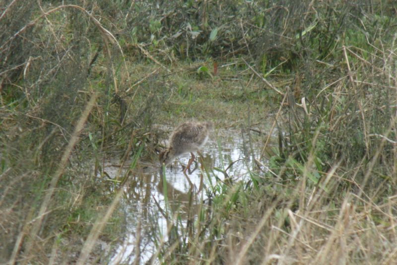All das ist untrügliches Zeichen dafür, dass da was im Busch ist: Der Nachwuchs ist unterwegs. Meist sah ich nur kleine Daunenbälle durchs Gras huschen. Ein Rotschenkelküken war nun so nett, sich längere Zeit in einem kleinen Priel aufzuhalten, den ich direkt von der Hütte einsehen konnte. So gelangen mir erste Beweisaufnahmen.