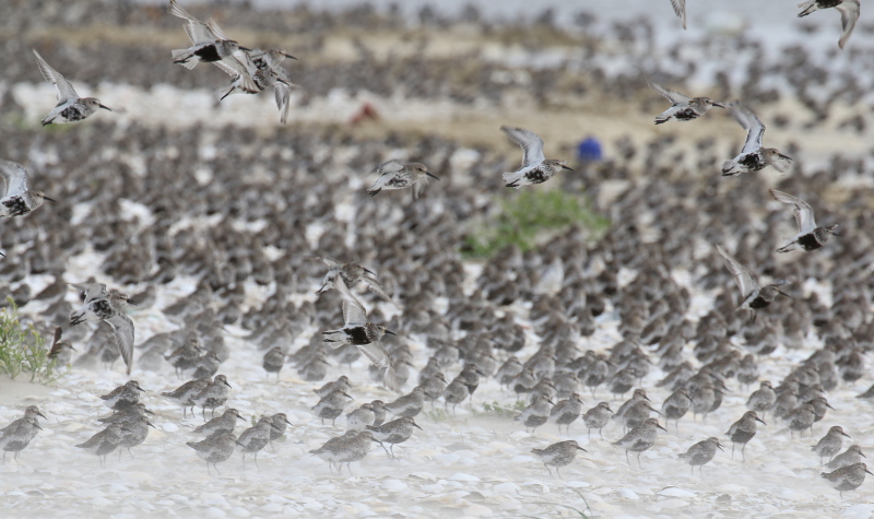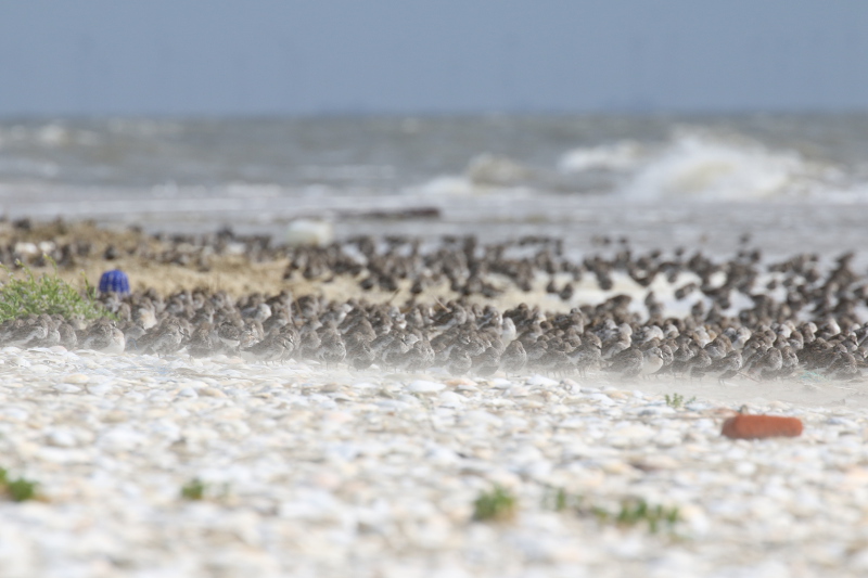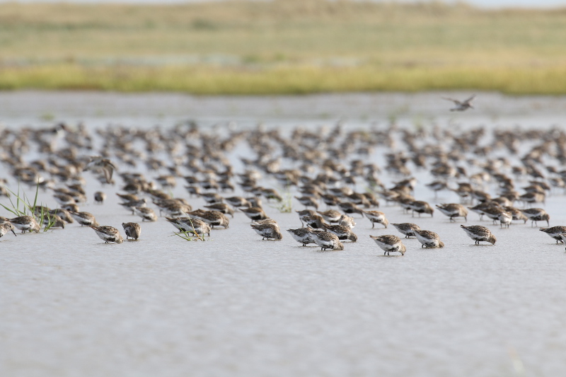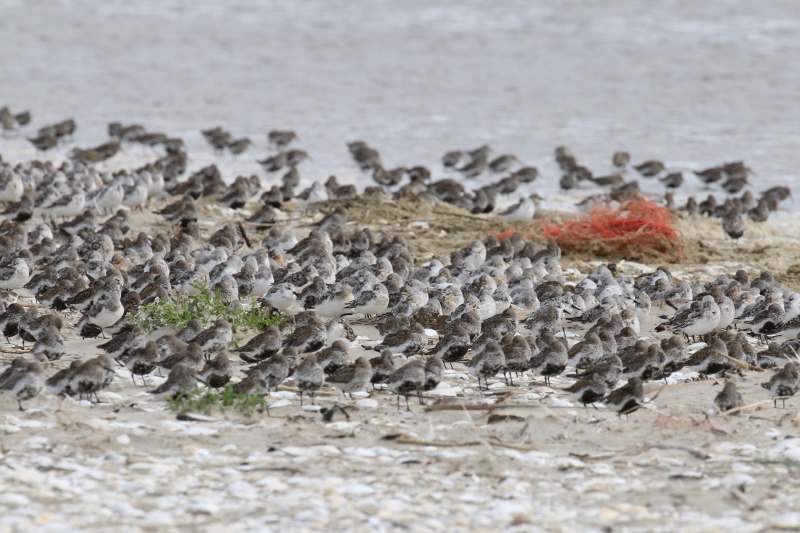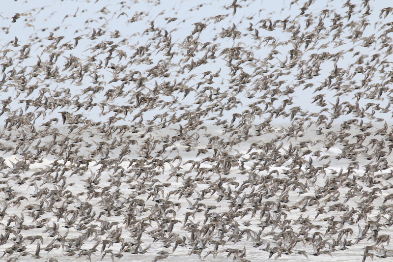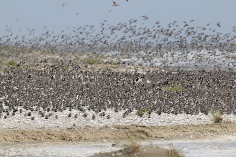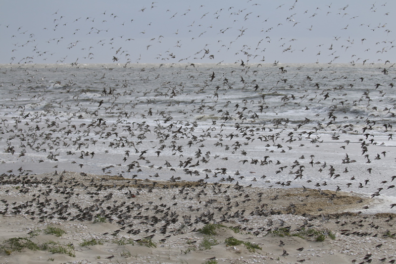Das Wattenmeer füllt sich weiter. Viele arktische Limikolen machen hier an der Drehscheibe des Vogelzugs Rast. Sie fressen vom reich gedeckten Tisch, erneuern ihr Federkleid und legen sich Energiereserven für die Weiterreise an. Bei Hochwasser rasten auf den Inseln, Außensänden oder in den Kögen abertausende Individuen. Wenn es aber wie in den letzten Tagen stürmt und das Hochwasser höher als gewöhnlich aufläuft, dann sind einige dieser Hochwasserrastplätze für die Vögel nicht mehr nutzbar und sie müssen enger zusammenrücken.