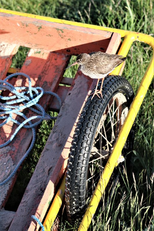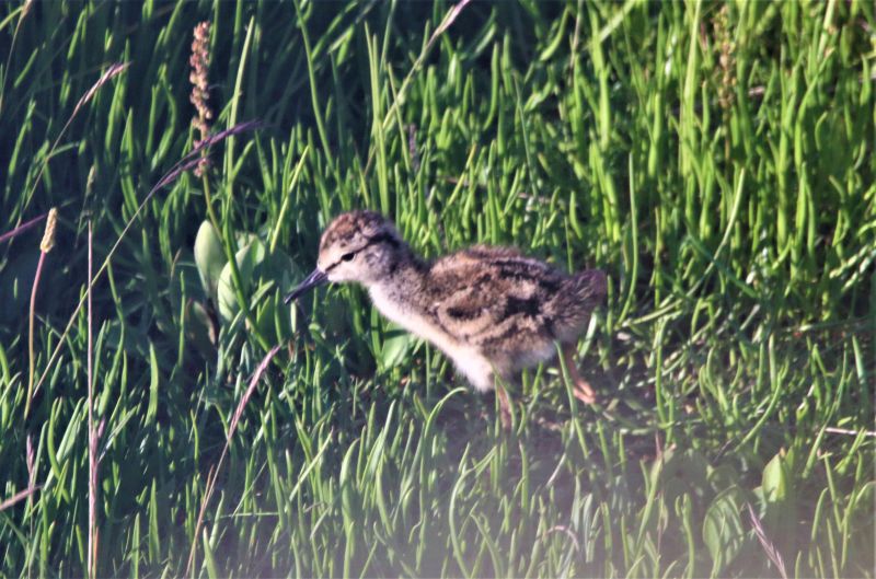 Während ich mir heute Abend Tee kochte und dabei aus dem Fenster schaute, konnte ich endlich das erste Rotschenkelküken entdecken! Tippelnd lief es über den Trampelpfand, während ein Elternteil erhöht von einem Pfeiler Wache hielt. Und dieses Küken hatte auch schon eine ordentliche Größe! Während ich mich umdrehte und zur Kamera griff, schaute ich aus dem anderen Fenster. Und auch hier: Rotschenkelküken! Dieses allerdings noch etwas frischer. Na, ist denn heute Rotschenkelküken-Ausgeh-Abend!? An mehreren Stellen rund um die Hütte konnte ich Küken erkennen.