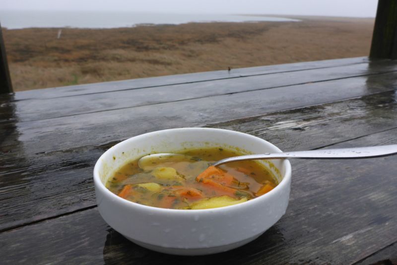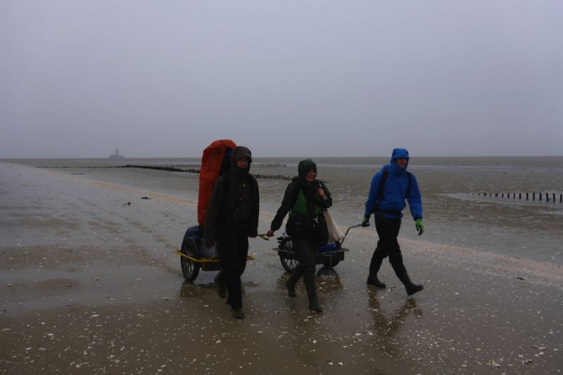 Das Wetter war den restlichen Tag dann aber doch nicht so gnädig: Es fing an zu regnen und der Wind frischte deutlich auf. Wir weichten im Laufe des Tages zwar ziemlich durch, doch das Gepäck blieb dank wasserdichter Verpackung trocken.
