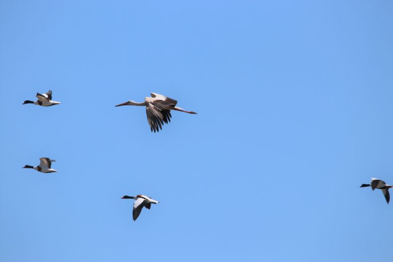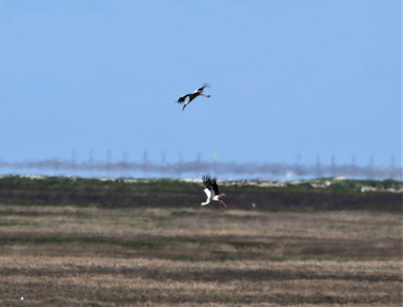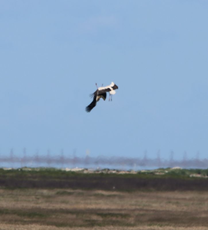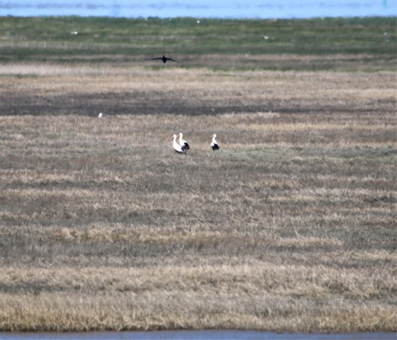 Störche mögen das Meer nicht so gerne und deshalb passiert es nur selten, dass die großen schwarz-weißen Vögel mit dem roten Schnabel und den roten Beinen, Trischen einen Besuch abstatten. Gestern war es aber überraschenderweise soweit: Gegen Mittag zogen aus dem Süden gleich drei Weißstörche Richtung Trischen. Dort konnte ich beobachten wie sich einer der Störche gemächlich während des Flugs am Schnabel kratzte. Das sah schon etwas lustig aus. Den meisten Brutvögeln passte die Anwesenheit der Störche nicht so richtig und insbesondere die Brandgänse (natürlich) wurden richtig wütend. Um sicher zu gehen, dass die drei Störche die Insel wieder verlassen, wurden diese von den schimpfenden Brandgänsen ein ganzes Stück eskortiert. Sie konnten aber nicht verhindern, dass sich alle drei kurz nördlich des Hafenpriels niederließen (und sich zuvor kurz untereinander kabbelten). Aber nach nicht mal einer Minuten zogen sie Richtung Norden davon. Das war ein kurzer aber für mich sehr erfreulicher Besuch.