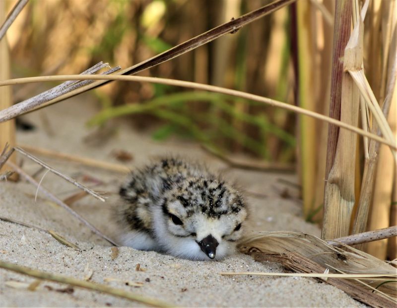 Endlich ist es soweit. Der cliffhanger wird aufgelöst! Täglich lugte ich bei meinem Gang über die Düne Richtung Strand zu den vier kleinen Eiern, die sich wirklich direkt neben dem Weg befanden. Eines Tages war es endlich so weit und ich konnte erkennen, dass die winzigen Küken in den Eiern begannen, ihre Schale aufzupicken. Am nächsten Tag fand ich dann dieses Küken, das sich nun bis auf den Dünenübergang vorgewagt hatte. Die drei anderen lagen noch hinter dem Meersenf, der mir immer als Orientierung diente, wenn ich zu dem Gelege schauen wollte. Sandregenpfeifer!