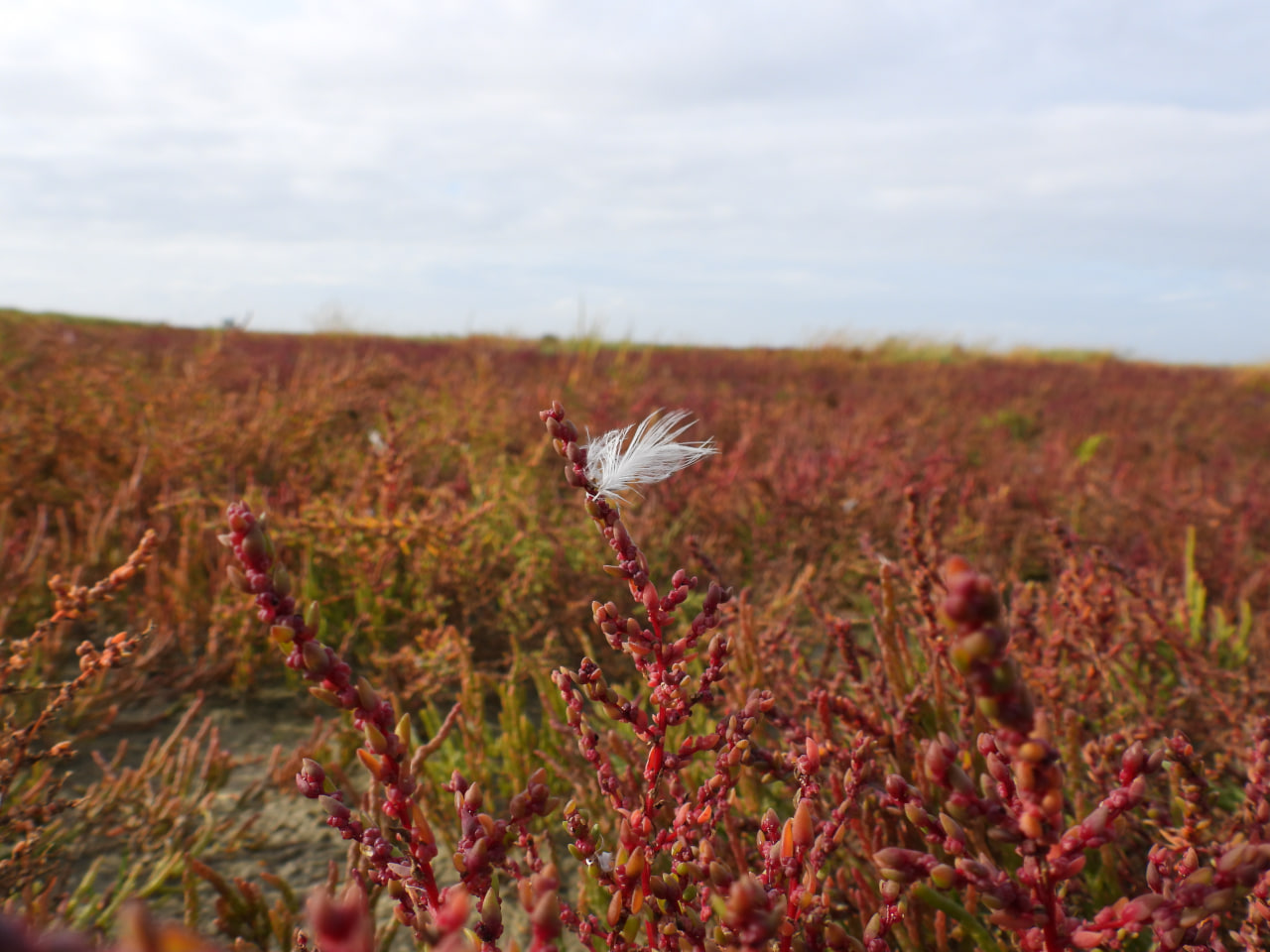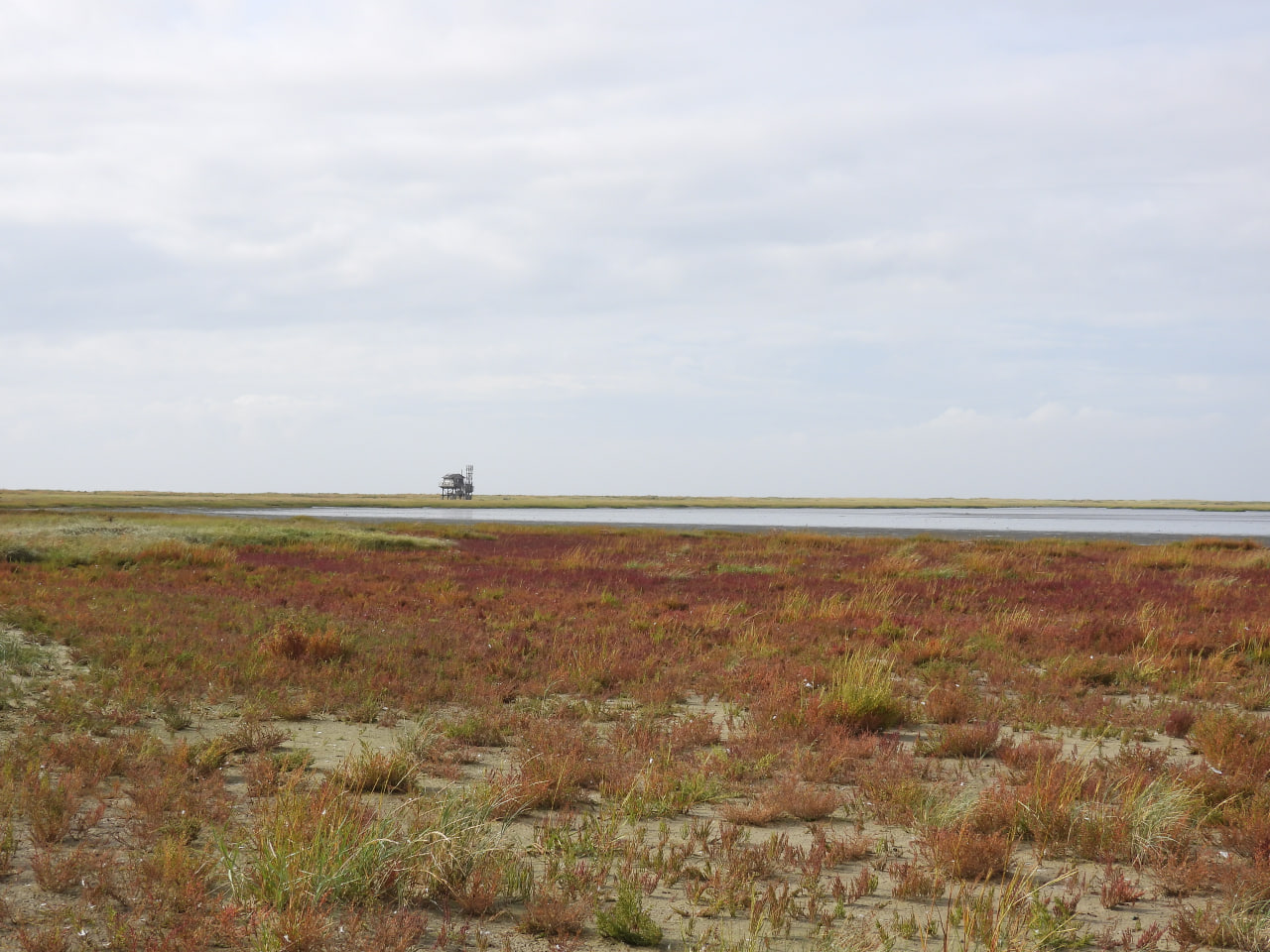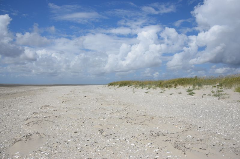 der Oktober zeigt sich mit schönsten Herbstfarben und dramatischem Himmel. Der Queller hat jetzt so viel Salz in seiner Blätter eingelagert das er sich rot färbt. Bald stirbt die Pflanze vollständig ab. Die Brandgänse sind weniger geworden und jetzt vollständig durchgemausert. Letzte Libellen fliegen durch die Salzwiesen und sonnen sich an windgeschützten Stellen. Über den Dünen jagen täglich Kornweihen und auch der Seeadler versucht sein Glück. Im Lockgebüsch freuen sich die Rotkehlchen über eine Trinkschale und die Zaunkönige mögen die aufgesägten Kokosnüsse vom Strand, welche das Lockgebüsch erweitern.