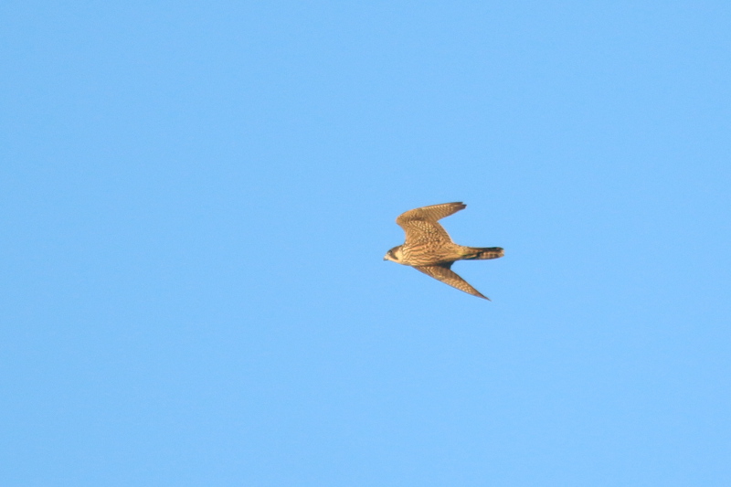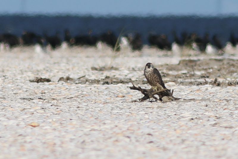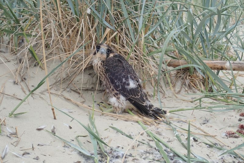 Auf einigen störungsfreien Außensänden und Inseln gibt es jedoch tatsächlich auf dem Boden brütende Wanderfalken-Paare, so auch auf Trischen seit 1999. In diesem Jahr brütete das Paar wieder erfolgreich in der Düne der Nord-Spitze. Seit einigen Wochen sind sie nun zu sechst unterwegs. Bei der Kontrolle der Löffler-Kolonie saßen die vier Jungvögel fast flügge in der Düne, später konnte ich sie auch fliegend beobachten. Während sie anfangs noch zusammen und mit den Eltern unterwegs waren, sehe ich sie mittlerweile nur noch einzeln.