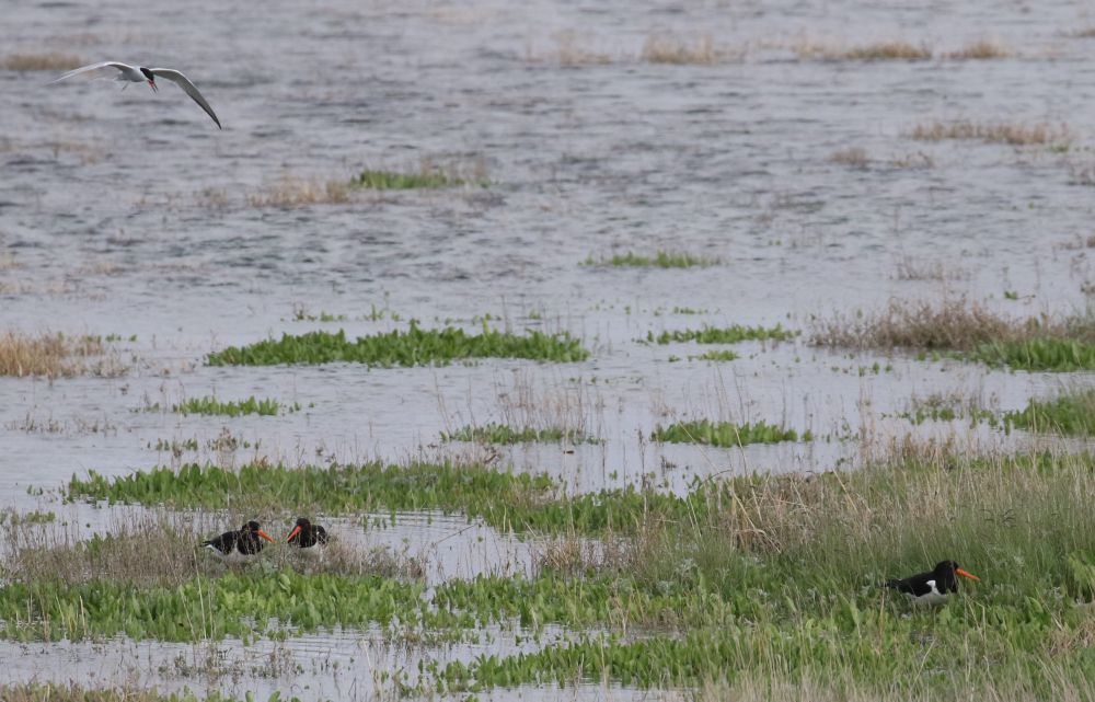 Bild 3: Rat- und hilflose Austernfischer, darüber warnende Flussseeschwalbe.