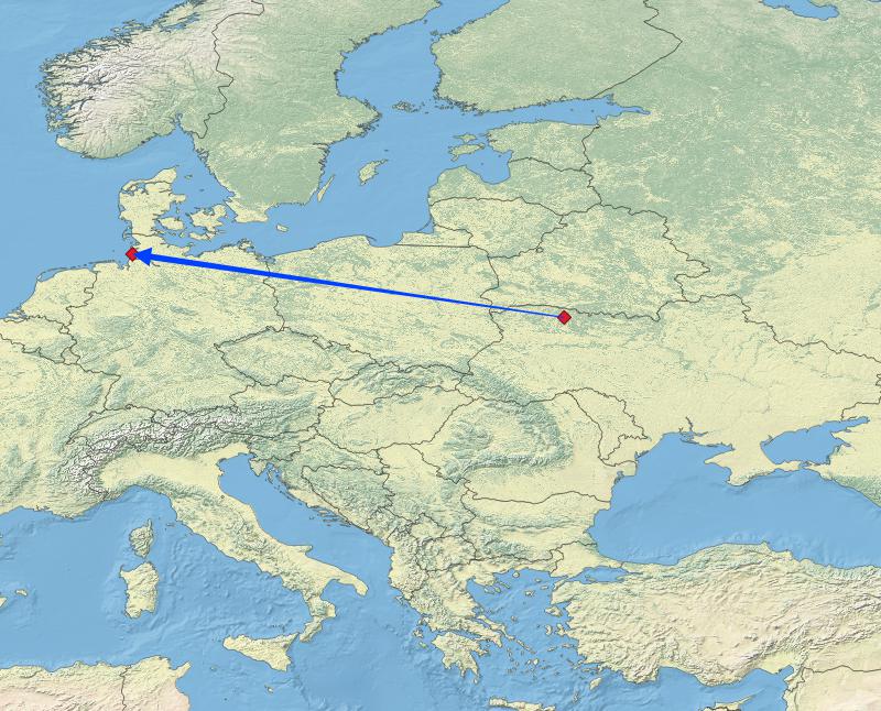 Der Vogel wurde im Mai 2017 mehr als 1240 km von Trischen entfernt auf einer Sandbank des Flusses „Slutsch“ in der Region Rivne in der nordwestlichen Ukraine als brütender Altvogel gefangen und beringt. Auch in diesem Jahr war er wieder an diesem Brutplatz anwesend.