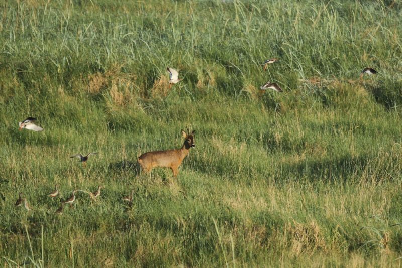 Da staunte ich mal wieder nicht schlecht über den haarigen, vierbeinigen Besuch, der gestern unerwartet Trischen erreichte. Ein Rehbock (Capreolus capreolus) sorgte nicht nur bei mir, sondern auch bei den brütenden Vögeln für Irritation.